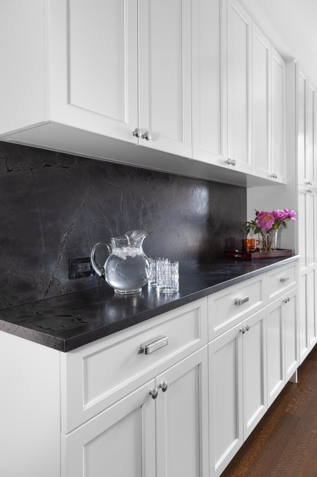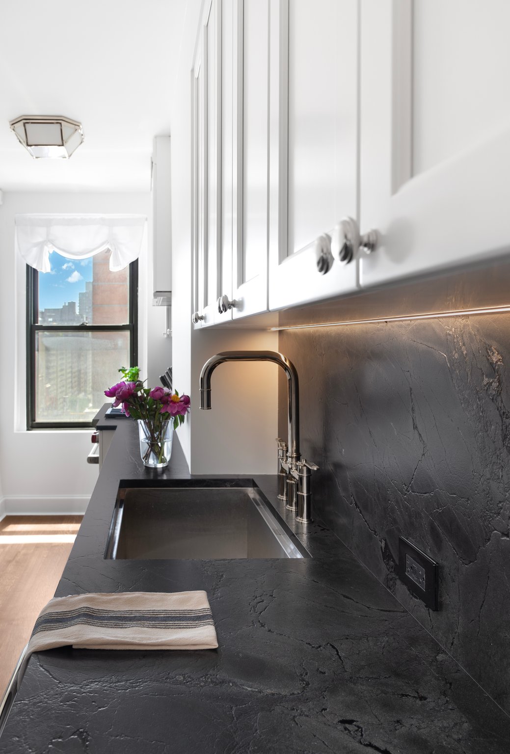 In the kitchen, our goal was to rebuild entirely, then blend modern functionality with period-inspired design. Classic, chantilly-lace-colored shaker cabinets from Miralis and reeded glass uppers nod to the building’s original architectural craftsmanship, while custom millwork and concealed wiring keep the space tight. The swan-necked Armstrong faucet is from Perrin & Rowe, while all hardware is polished nickel from Classic Brass. By opening the kitchen to the main living space, the layout feels brighter, more connected, and better suited for contemporary living—all without compromising the home’s pre-war character.