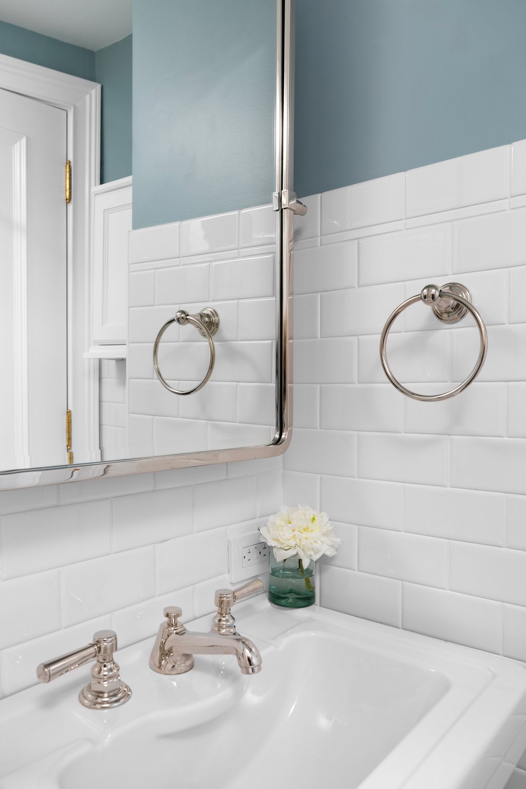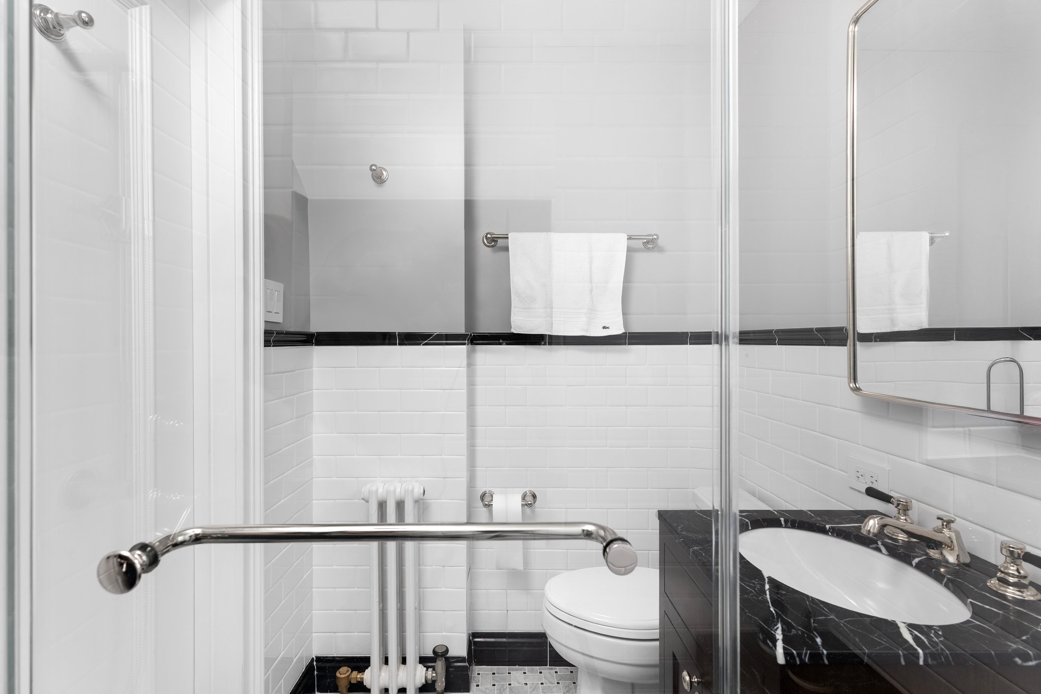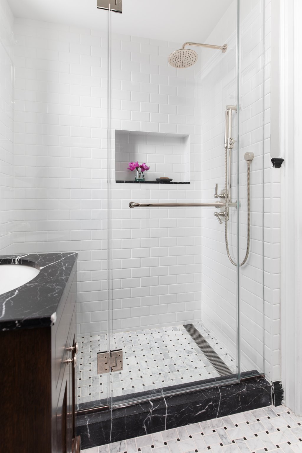 While the original bathrooms were beyond salvageable, our design approach aimed to reintroduce classic pre-war character with thoughtful, high-quality updates. In the primary bath, we created a custom mocha vanity, which we paired with white subway tile on the walls and custom basketweave tiles for the flooring, then accented with a black marble Nero Marquina chair rail tile. All fixtures are period-appropriate, from the Signature Hardware undermount porcelain sink to the Phylrich Hex Traditional widespread faucet with satin black lever handles.