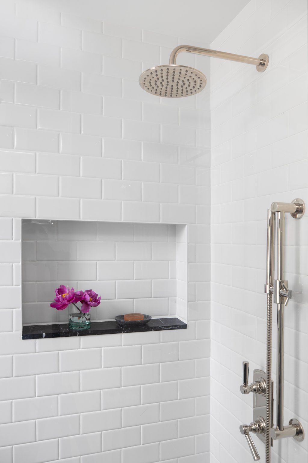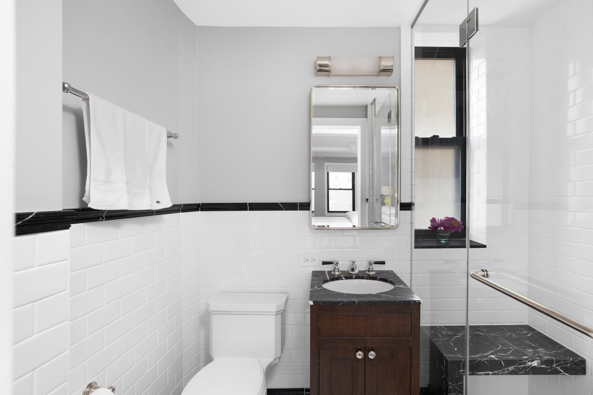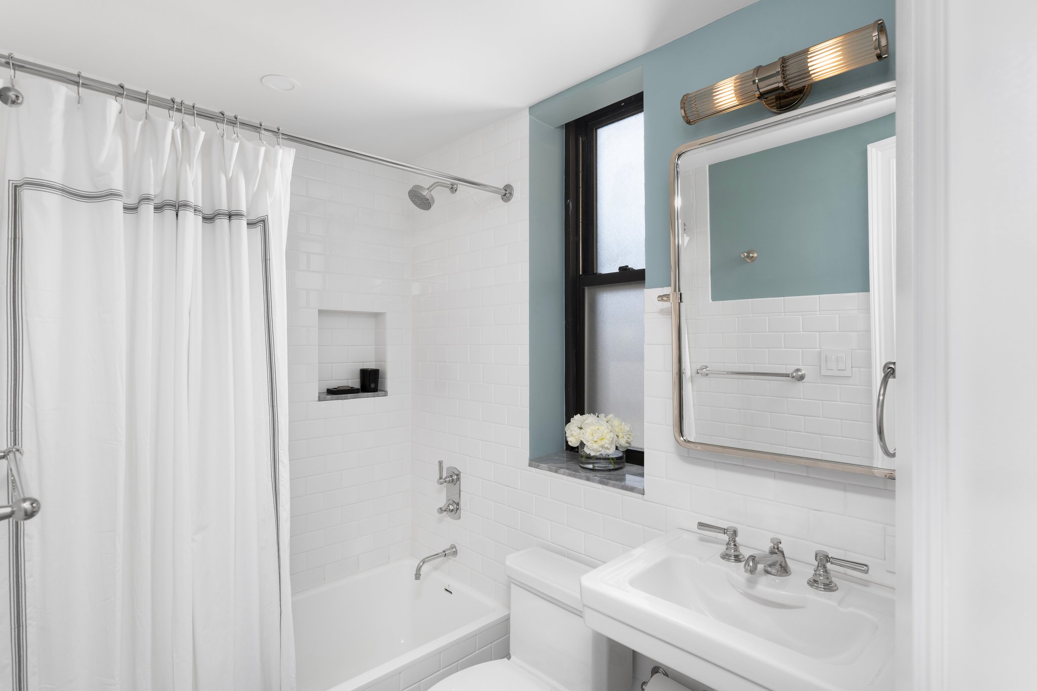 While the original bathrooms were beyond salvageable, our design approach aimed to reintroduce classic pre-war character with thoughtful, high-quality updates. In the primary bath, we created a custom mocha vanity, which we paired with white subway tile on the walls and custom basketweave tiles for the flooring, then accented with a black marble Nero Marquina chair rail tile. All fixtures are period-appropriate, from the Signature Hardware undermount porcelain sink to the Phylrich Hex Traditional widespread faucet with satin black lever handles.