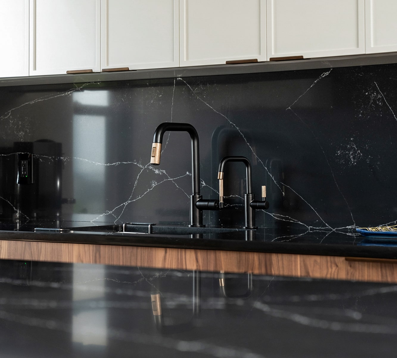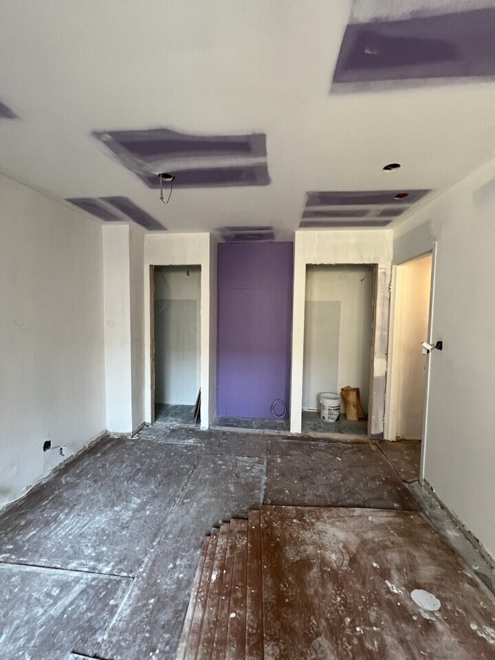 Once we opened up the space, we were able to execute our design plan without issue. Leading with a focal point kitchen, we created a walnut-centric design with painted touches to lighten up the aesthetic and create a warmer environment, including lighter grays in the adjoined dining room. All cabinetry was custom designed to fit the space. We then juxtaposed the light tones by placing darker accents throughout, noticeably the black marble countertops in the kitchen. We also mingled in navy blues and greens in the bedroom, office and other priority areas.