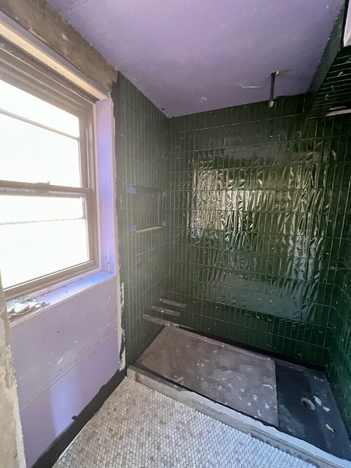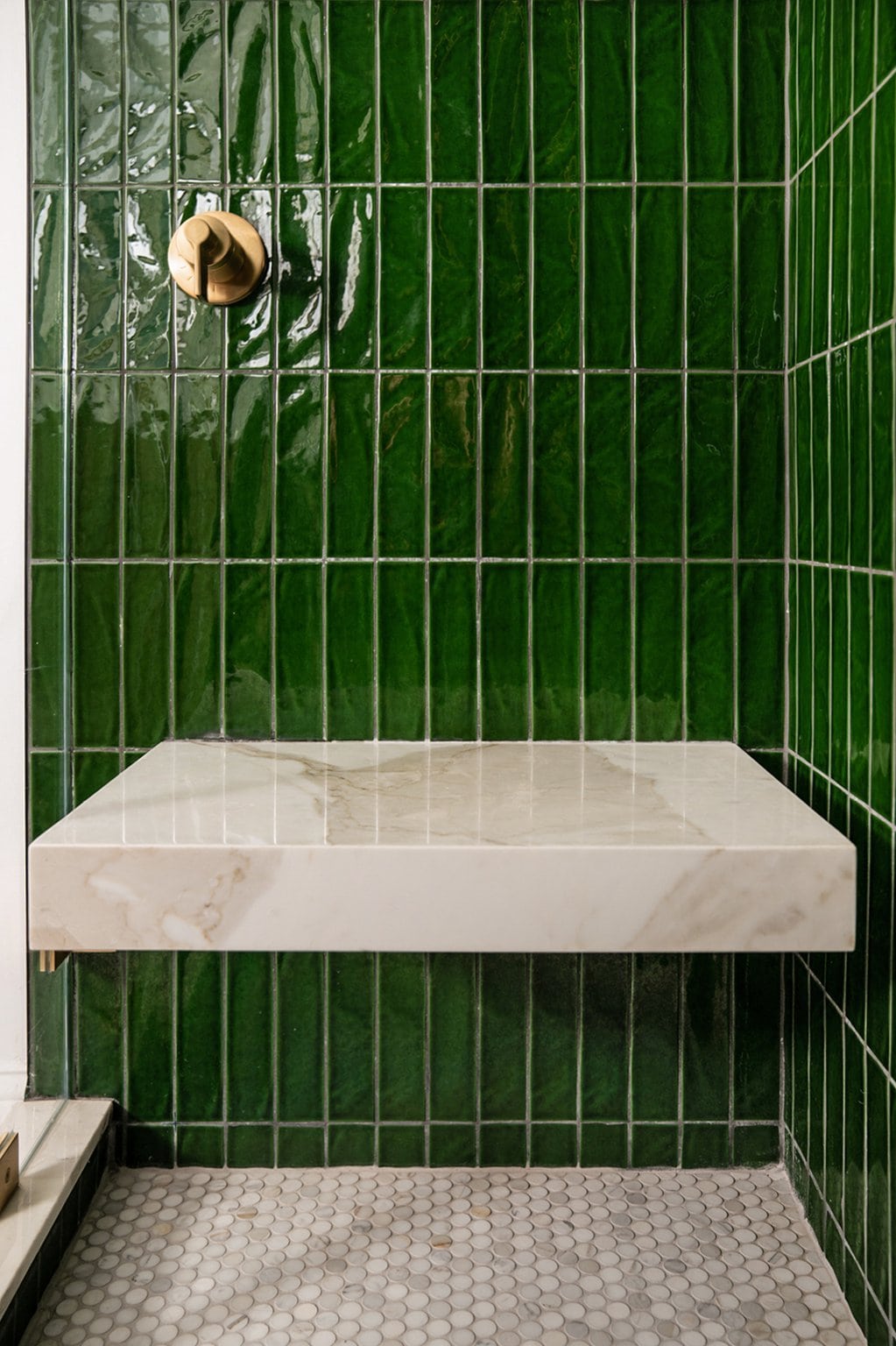The primary en-suite bathroom required an especially custom touch and came out eloquent as ever. Beyond the custom floating marble bench in the shower that was specifically designed for client (find out why here), we wanted the space to really drive home the mid-century modern design. To accomplish this, we added emerald green tile up top, then paired that with Calcutta penny tile and brass finishes from Kohler, plus an extremely rich West Elm Mid Century Walnut vanity to add earthy tones to the space and ground the design.