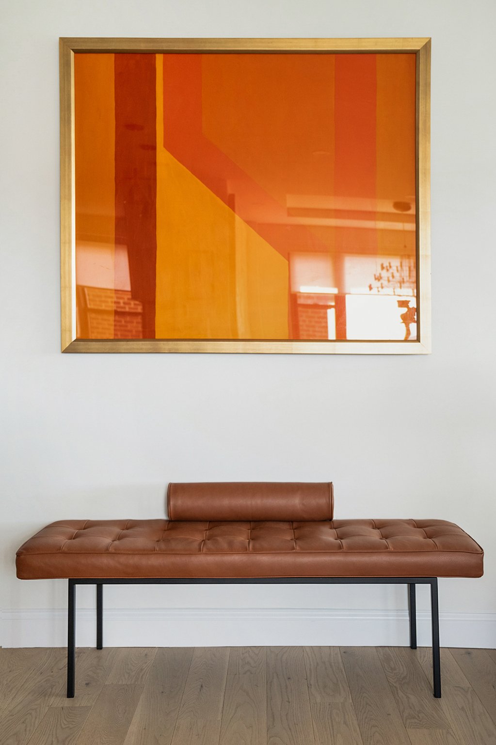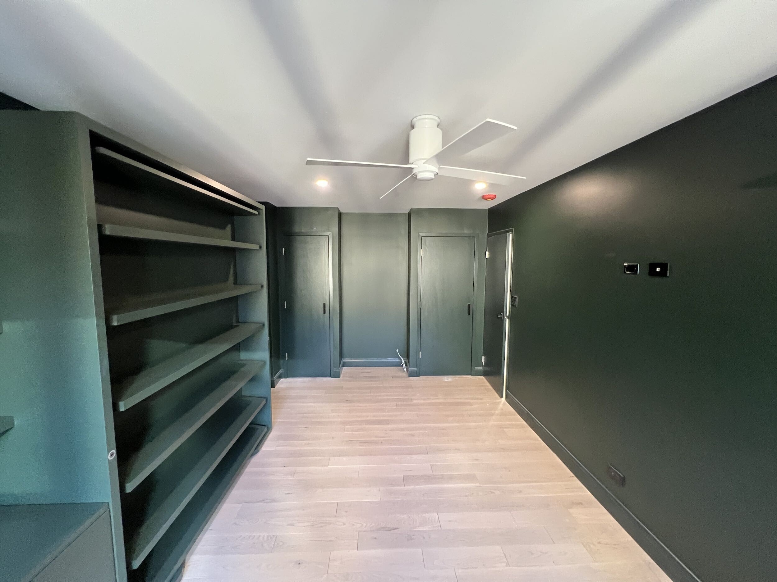 To add to the mid-century modern design scheme, clean white oak engineered floors were installed throughout the apartment, giving the flooring a rich look with a welcomed durability. From there, custom millwork was added in the office as well, offering shelving, a desk, and custom closets to accommodate the client's peloton bike.