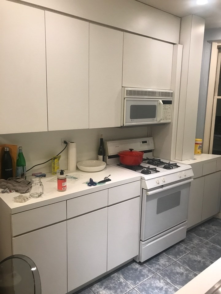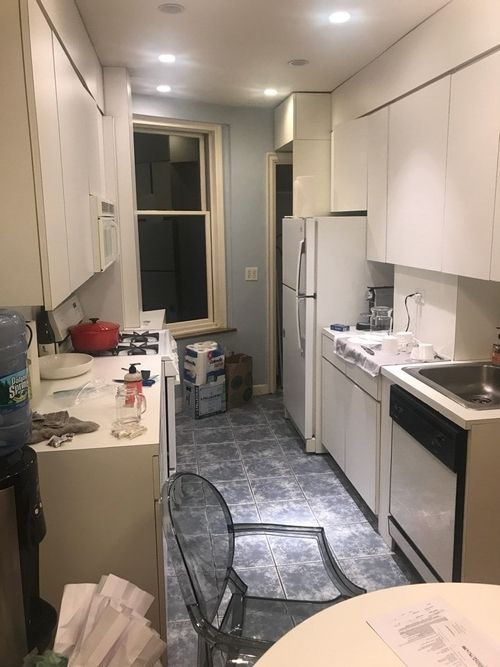 As you can see from the before images below, this walk-up kitchen needed some serious TLC when we arrived. To modernize the space, we added flat-panel cabinetry, which isn't often associated with pre-war renovations. However, with the seamless, veined quartz countertops and backsplash, the cabinets blend well, trying everything together for a blended contemporary-classic look that makes the cooking space immediately more manageable.
