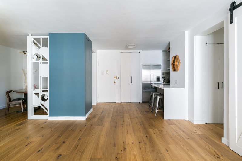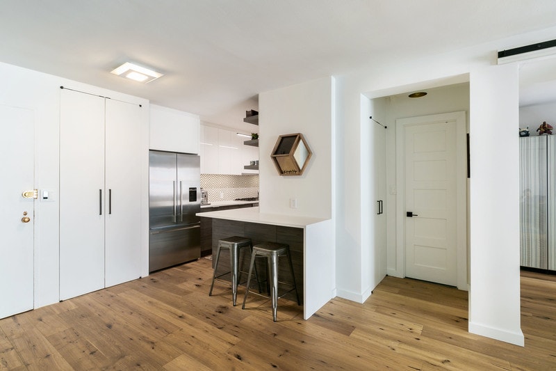 This specific NYC apartment renovation project in a Columbus Circle co-op involved the horizontal combination of an existing one bedroom apartment with a newly purchased one bedroom unit next door. As is common with almost any project involving the adjoining of two apartments, the scope of construction included work being done in both units to ensure a uniform floor and ceiling height and the integration of the electrical system. The scope of work also included a full renovation of a kitchen, in a mid-century Scandinavian design, plus the renovation of a bathroom, new floors, doors, paint, and general carpentry work.