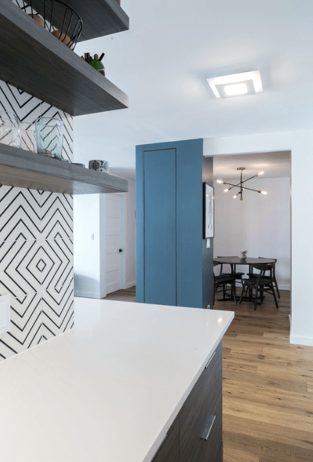 During the design consultation our design team suggested incorporating elements of wood in the kitchen base cabinets and glossy white flat panel wall cabinets. The combination of the two not only tied the modern European together with the transitional, but it also sparked the mid-century Scandinavian theme throughout the rest of the apartment. With this in mind, our design and build team procured an engineered wood floor at half the cost of what a hardwood floor would cost. Adding to this, we incorporated a barn wood sliding door in the living room, giving our customers the open layout feel they want for when friends and family are over yet being able to also have privacy when needed.