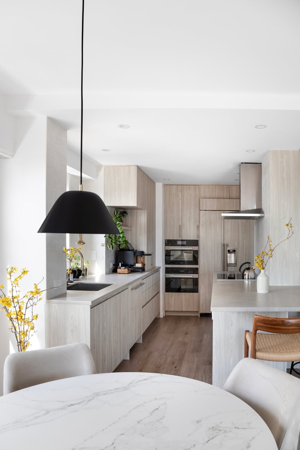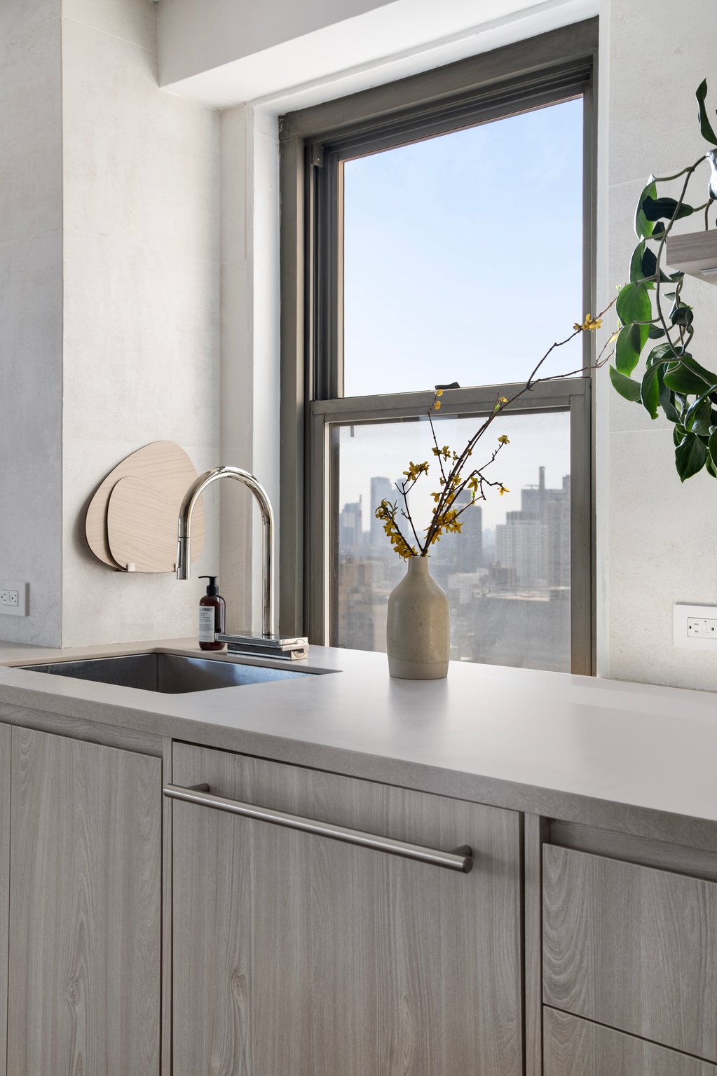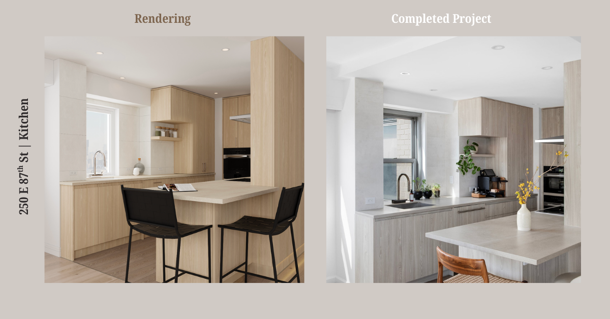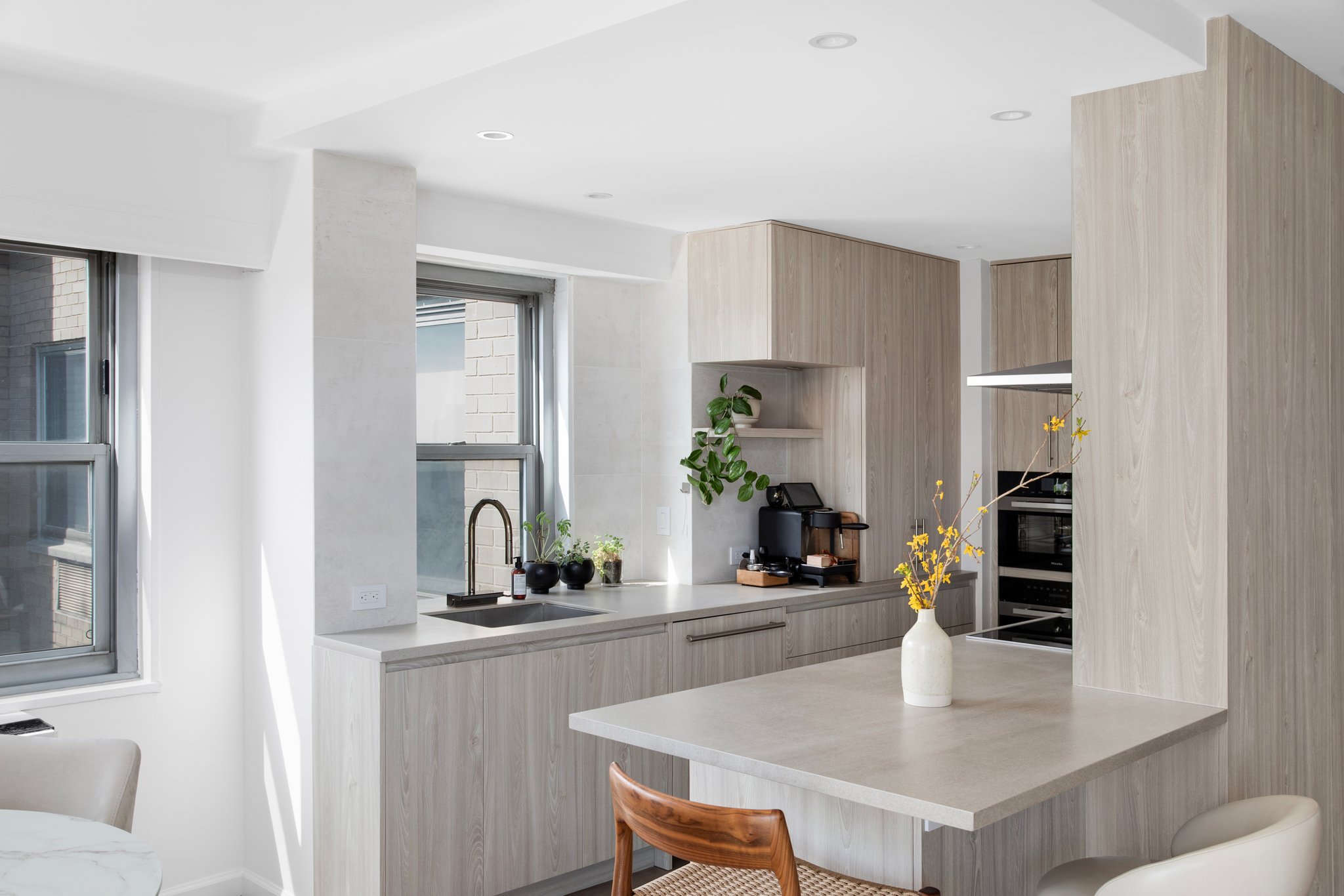 The focal point of our renovation at 250 East 87th was certainly the clean, minimalist kitchen design. While planning initially aimed for a fully open kitchen, the layout was strategically adapted to accommodate an existing four-foot structural wall. Rather than disrupt the design, the wall was seamlessly wrapped in the same cabinetry finish, maintaining visual consistency and style. With a modern design in aim, we leaned into Scandinavian influence, emphasizing material cohesion and modern simplicity - accentuated with Porcelanosa X-Tone Aged Clay Nature stone for the countertop and backsplash.