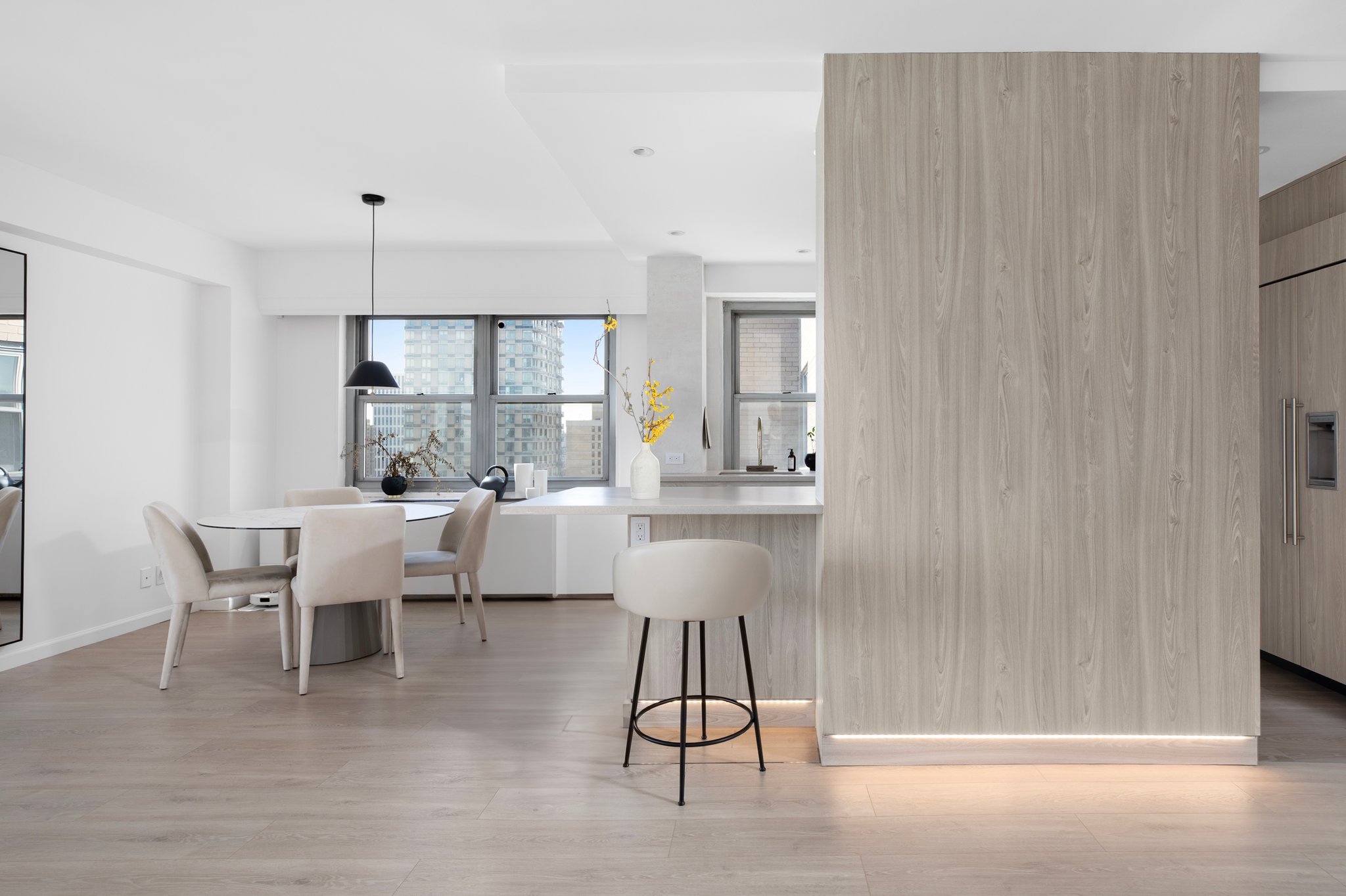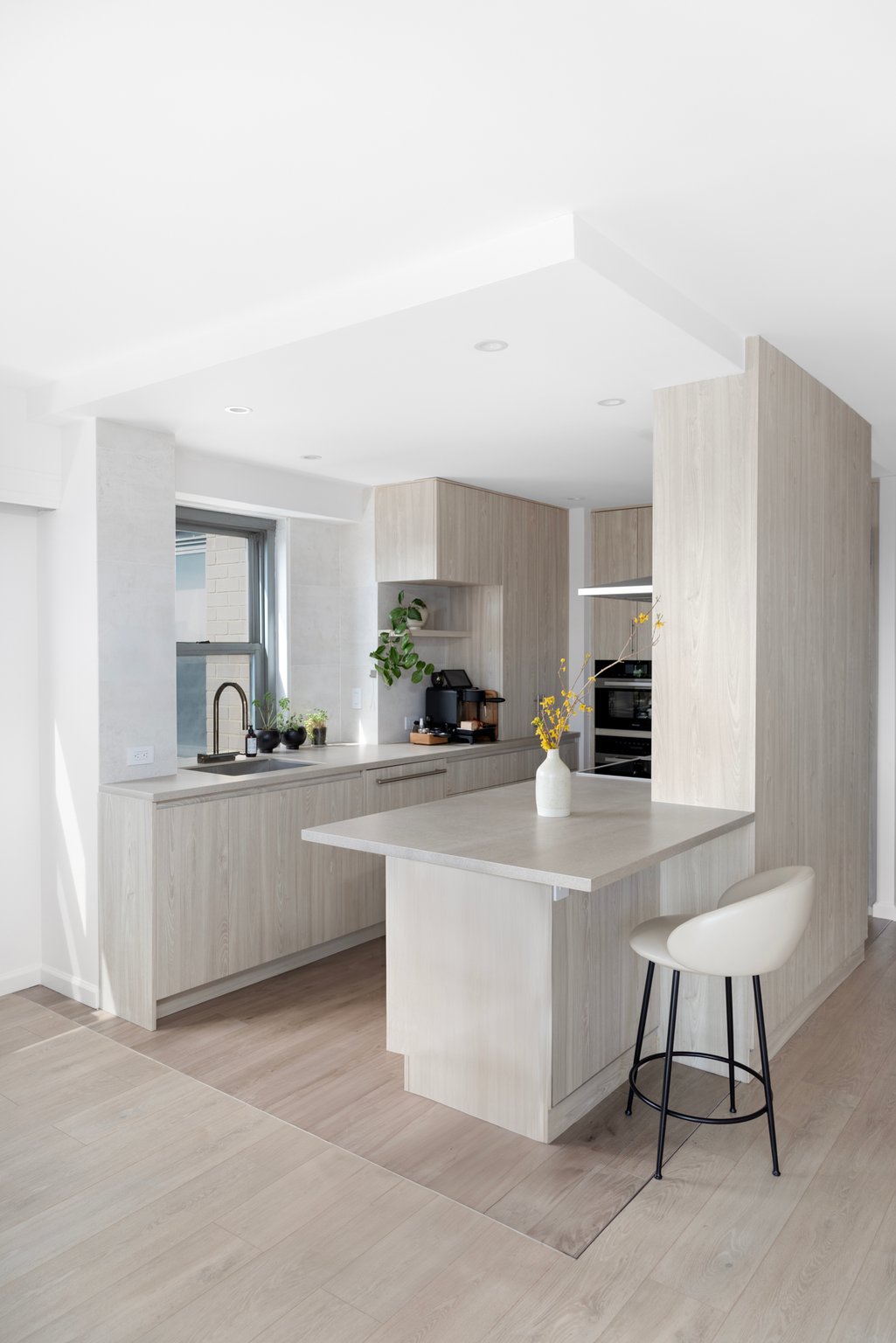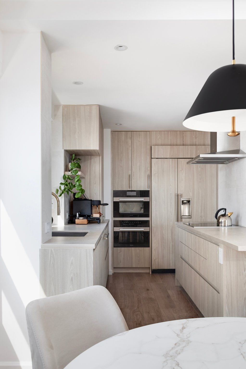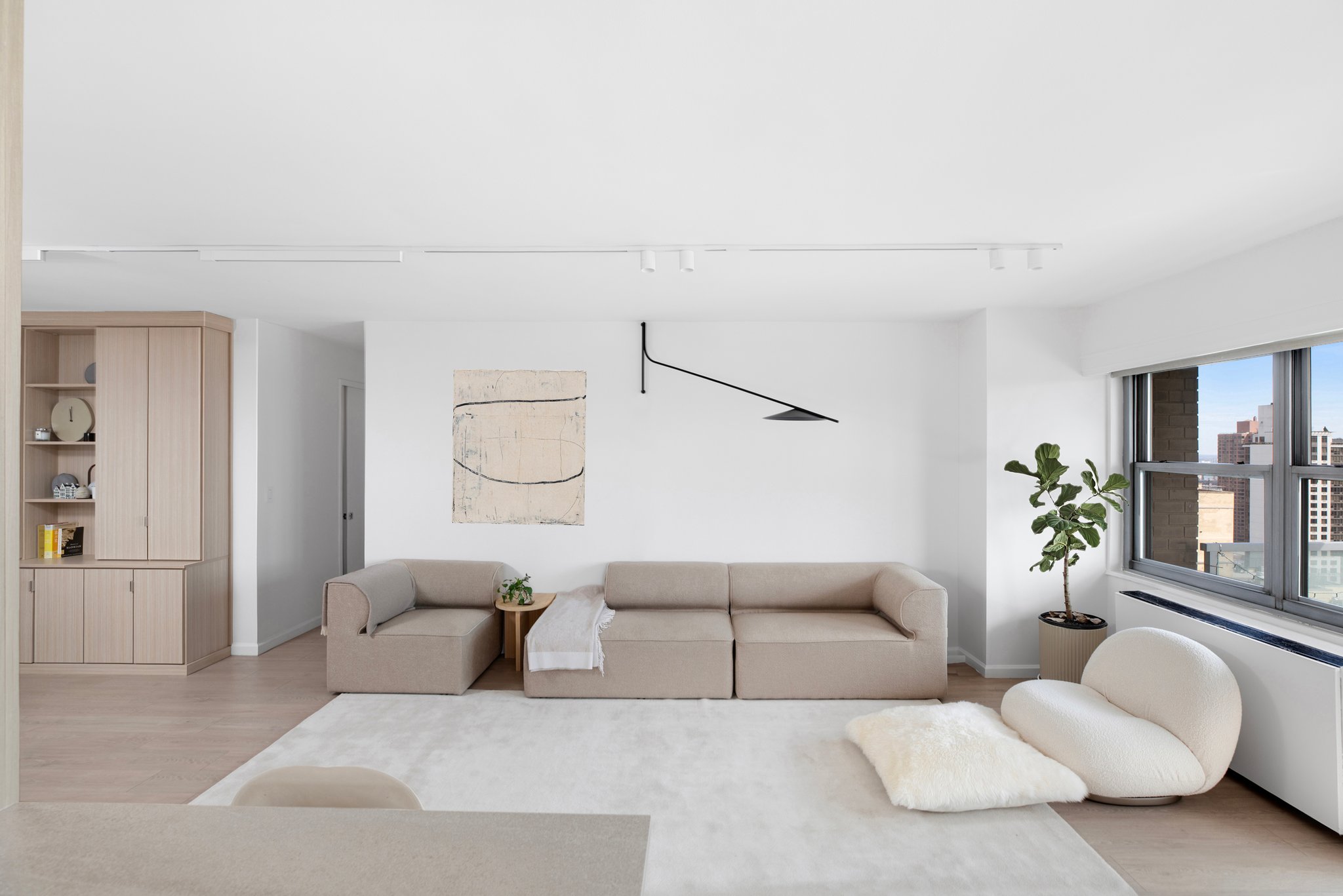 The focal point of our renovation at 250 East 87th was certainly the clean, minimalist kitchen design. While planning initially aimed for a fully open kitchen, the layout was strategically adapted to accommodate an existing four-foot structural wall. Rather than disrupt the design, the wall was seamlessly wrapped in the same cabinetry finish, maintaining visual consistency and style. With a modern design in aim, we leaned into Scandinavian influence, emphasizing material cohesion and modern simplicity - accentuated with Porcelanosa X-Tone Aged Clay Nature stone for the countertop and backsplash.