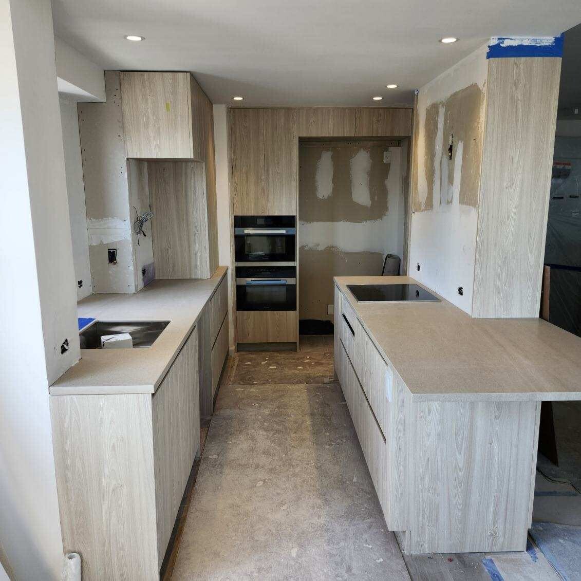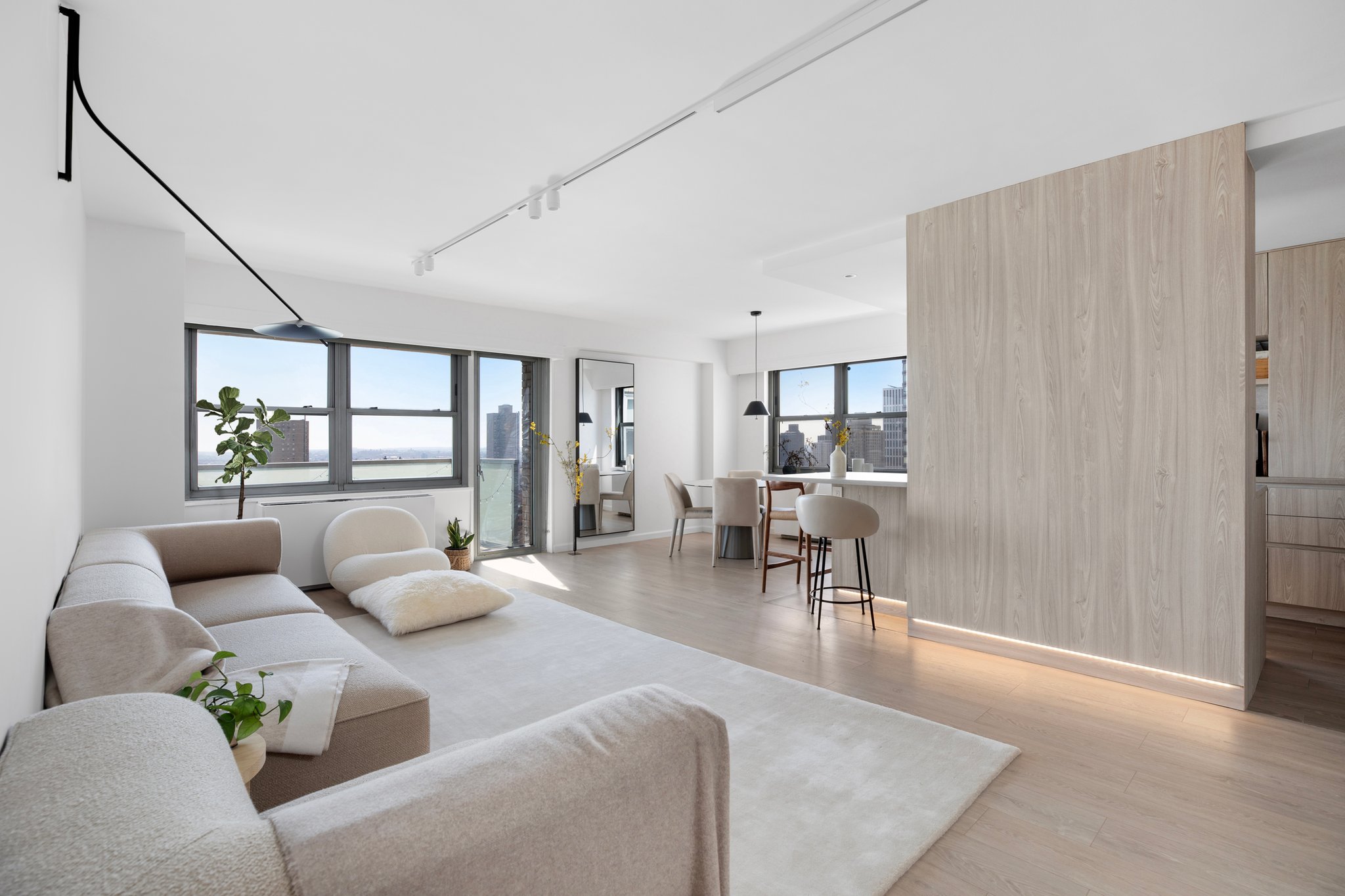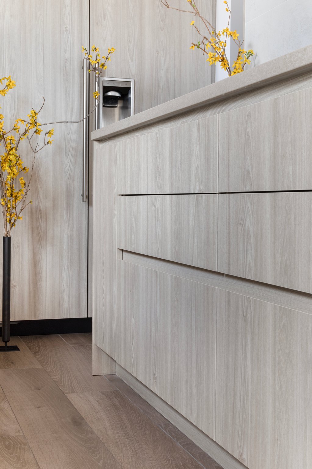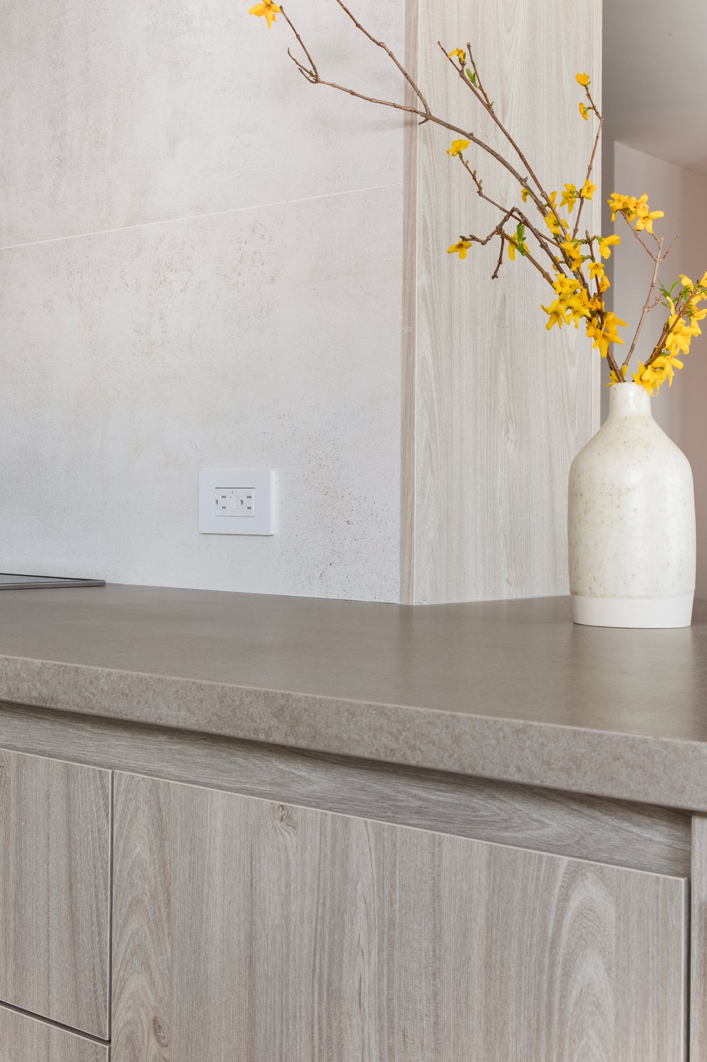 The focal point of our renovation at 250 East 87th was certainly the clean, minimalist kitchen design. While planning initially aimed for a fully open kitchen, the layout was strategically adapted to accommodate an existing four-foot structural wall. Rather than disrupt the design, the wall was seamlessly wrapped in the same cabinetry finish, maintaining visual consistency and style. With a modern design in aim, we leaned into Scandinavian influence, emphasizing material cohesion and modern simplicity - accentuated with Porcelanosa X-Tone Aged Clay Nature stone for the countertop and backsplash.