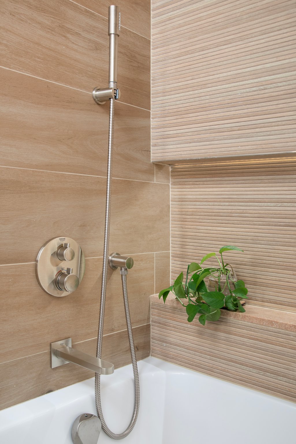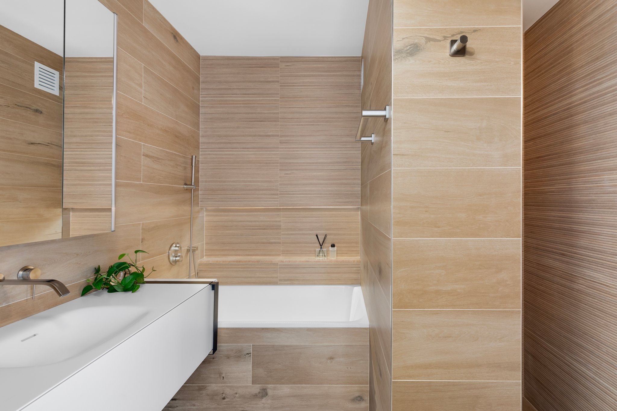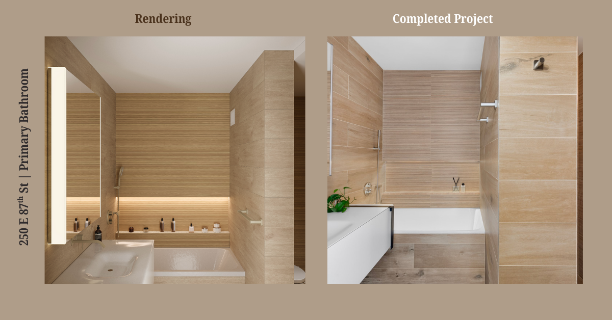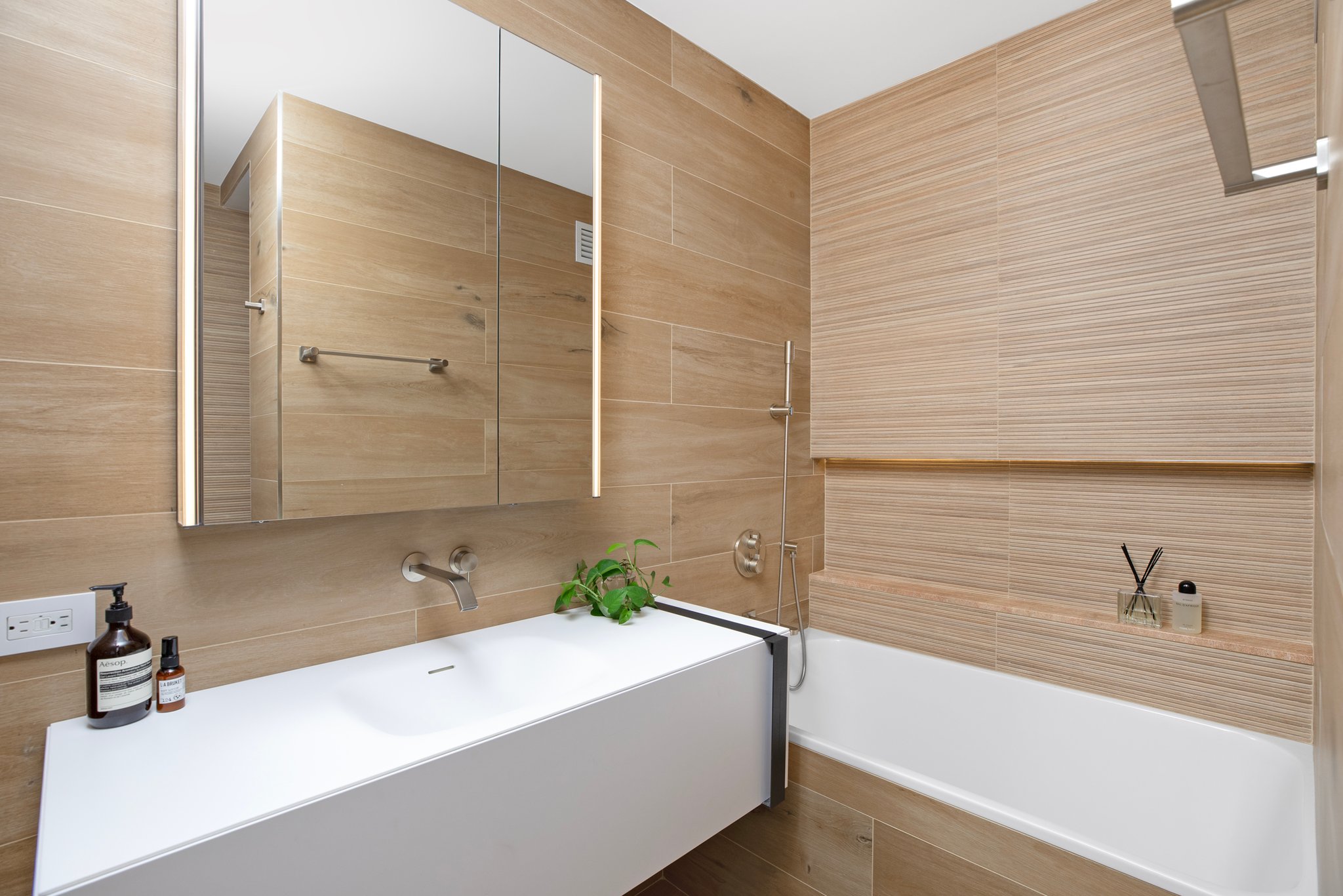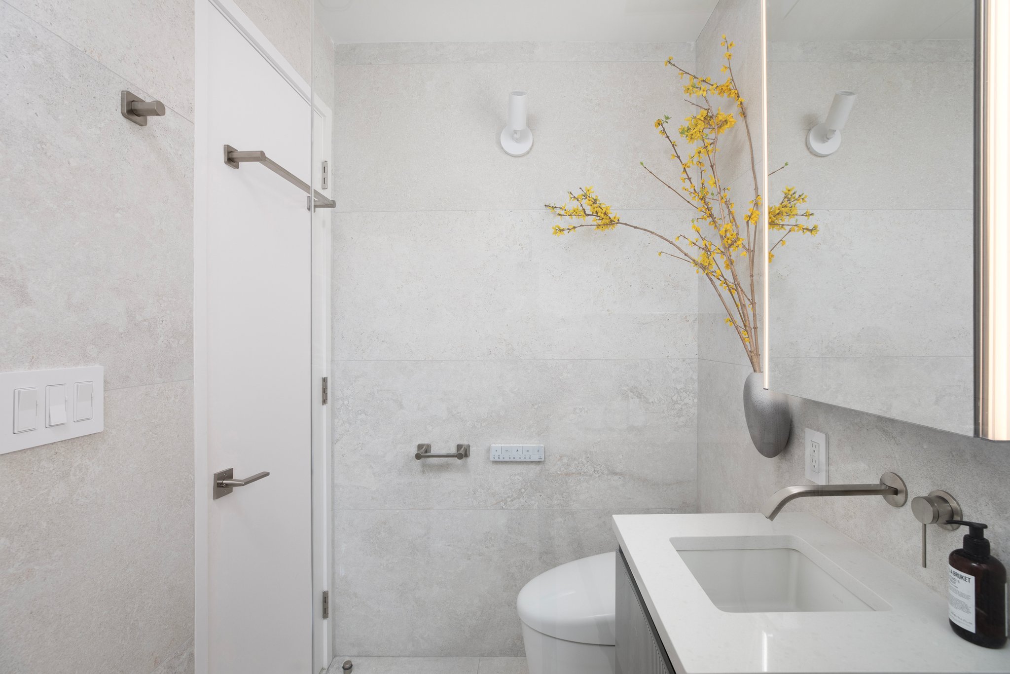 To expand the primary bathroom and create a more spa-like layout, we reconfigured an adjacent closet—carefully working around an inconveniently-placed Verizon building riser to incorporate a functional water closet with a wall-hung TOTO toilet and integrated bidet. The adjusted space features a distinct blend of wood-effect Porcelanosa Ice Nebraska Tea tiles, delivering a textured, organic aesthetic. High-quality fixtures from Grohe and Kohler complement the design, while an Anatoli Yellow polished quartz stone adds warmth and texture to the palette. The final product is a personalized retreat that balances function with calm, curated design.