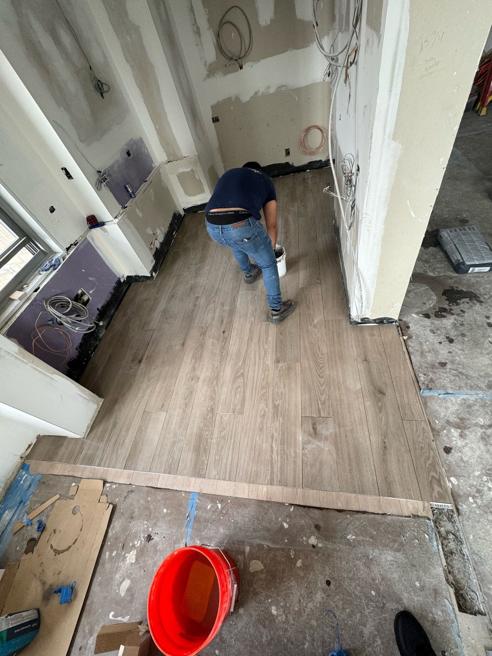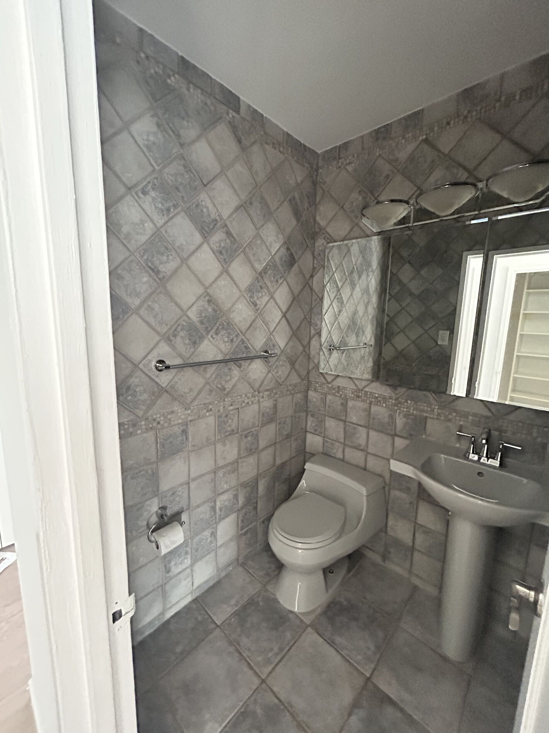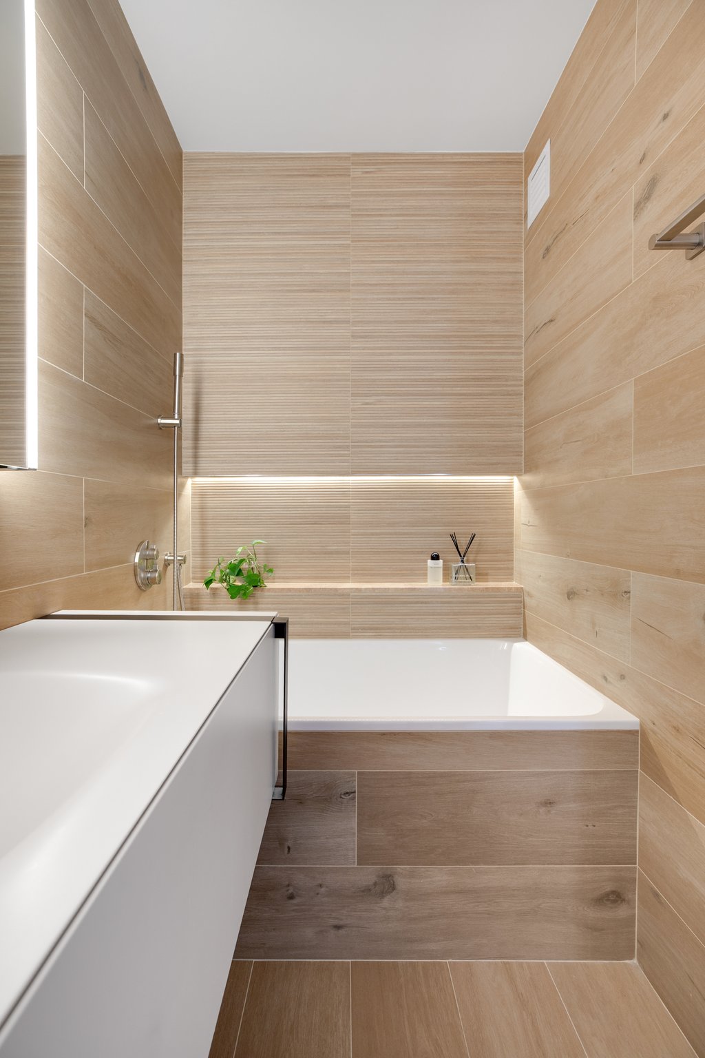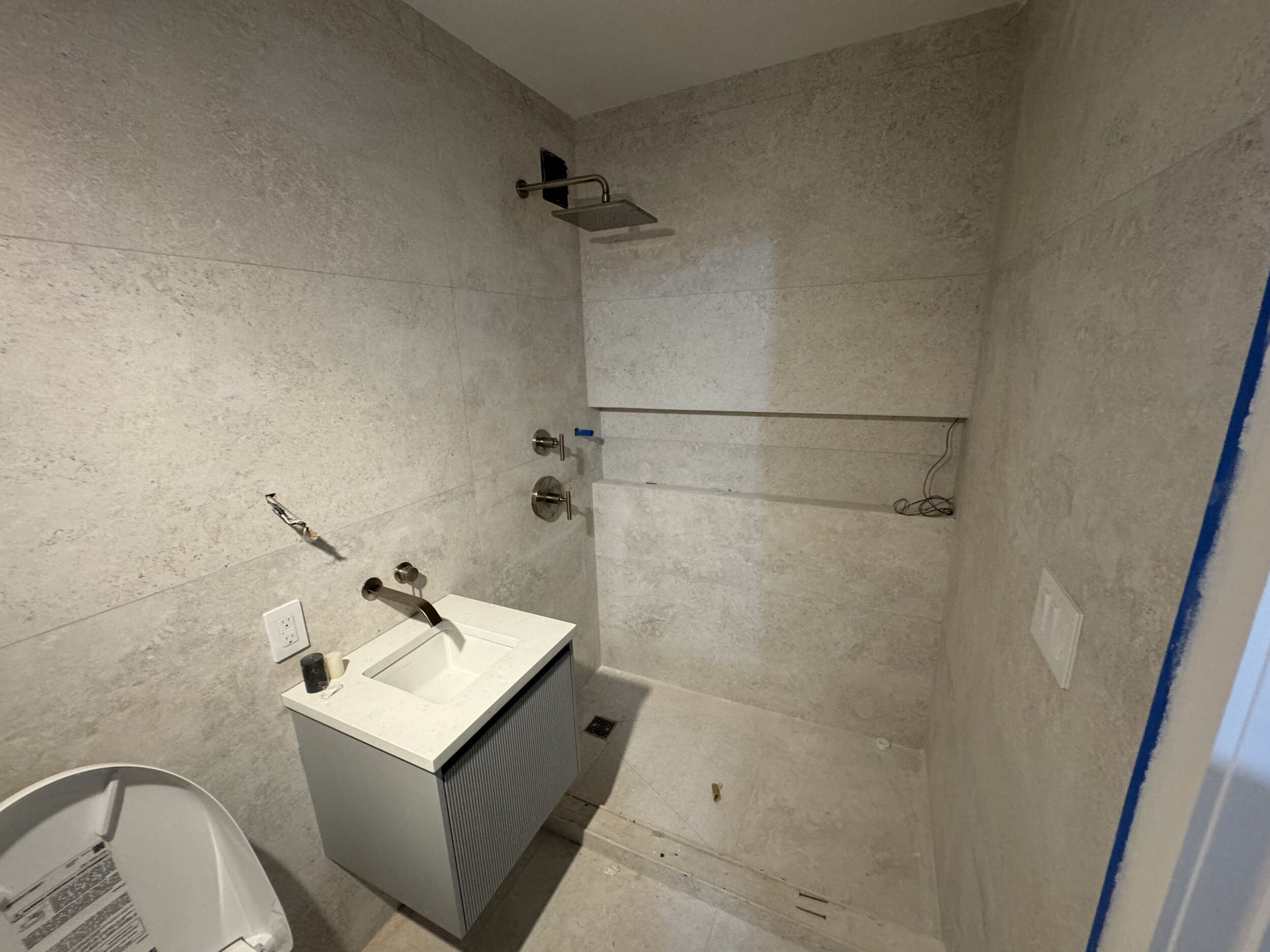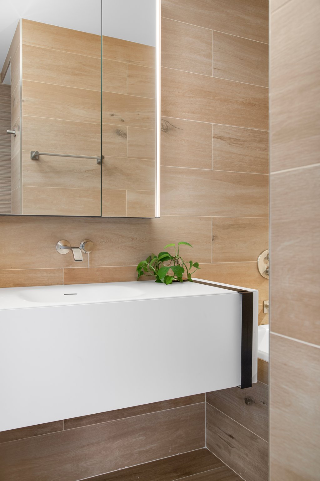 To expand the primary bathroom and create a more spa-like layout, we reconfigured an adjacent closet—carefully working around an inconveniently-placed Verizon building riser to incorporate a functional water closet with a wall-hung TOTO toilet and integrated bidet. The adjusted space features a distinct blend of wood-effect Porcelanosa Ice Nebraska Tea tiles, delivering a textured, organic aesthetic. High-quality fixtures from Grohe and Kohler complement the design, while an Anatoli Yellow polished quartz stone adds warmth and texture to the palette. The final product is a personalized retreat that balances function with calm, curated design.