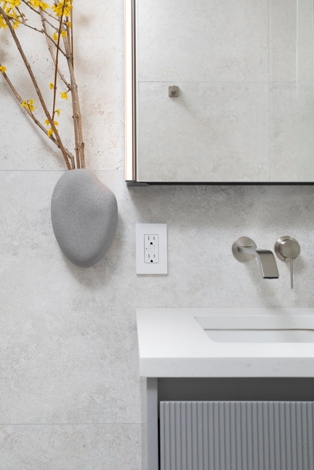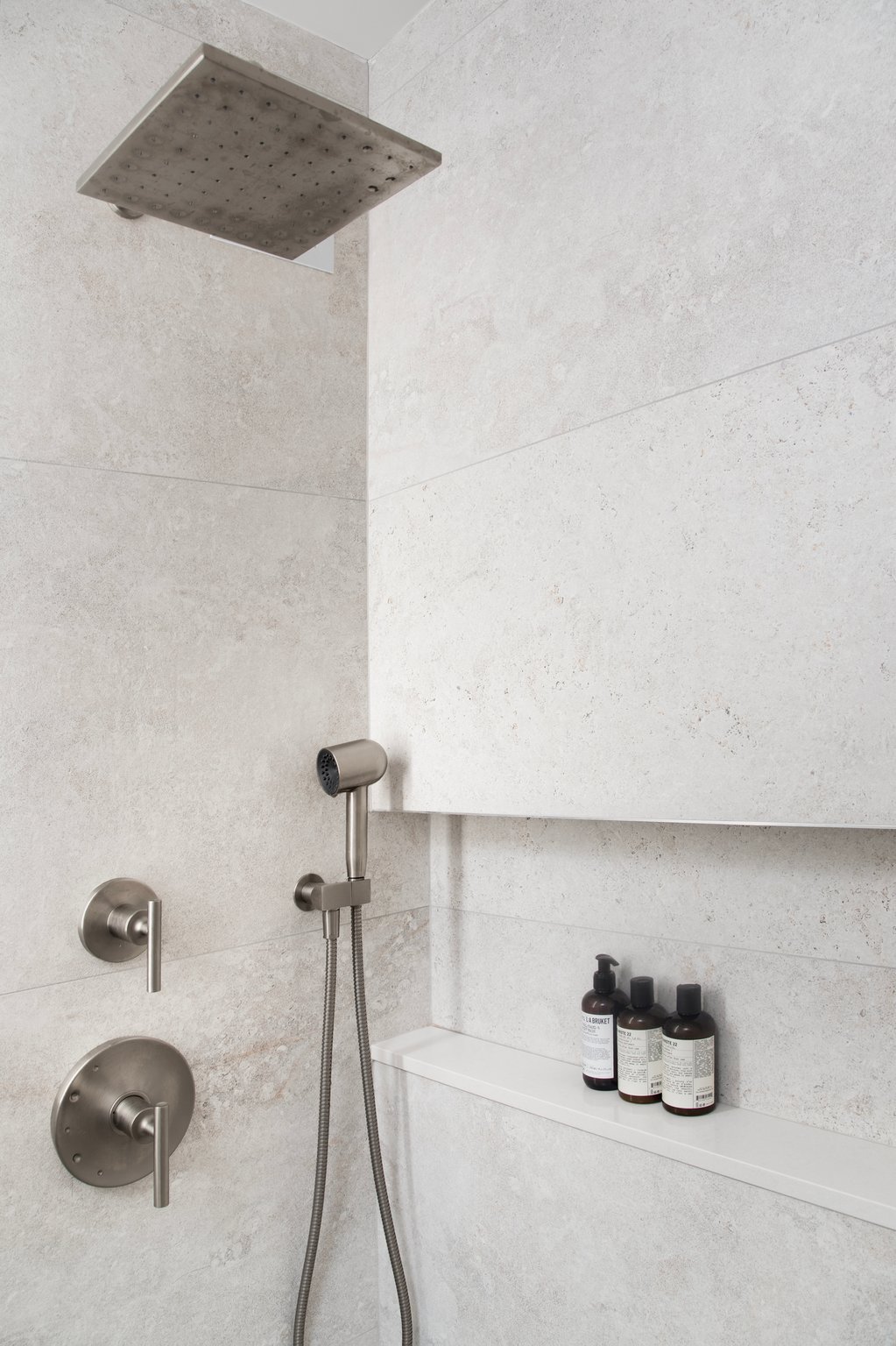 The secondary bath also leans into spa-like simplicity, highlighted by Liston Hannover Bone Topo tiles offering a soft concrete look for added warmth and texture. A floating Chiara vanity and wall-to-wall LED niche offer clean, modern lines, while Kohler fixtures and Caesarstone Organic White quartz keep the overall palette crisp. The result is a calm, functional, and thoughtfully refined space that feels more like a getaway than a bathroom.