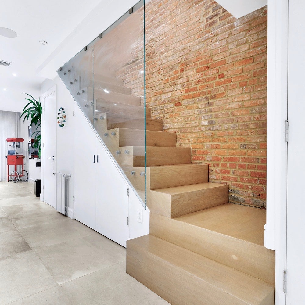 One way to create division between spaces with minimal spatial investment is with glass divider walls. These glass partitions are a sleek and practical method to create transitions that breathe, like the one we built alongside the staircase in this SoHo townhouse renovation.