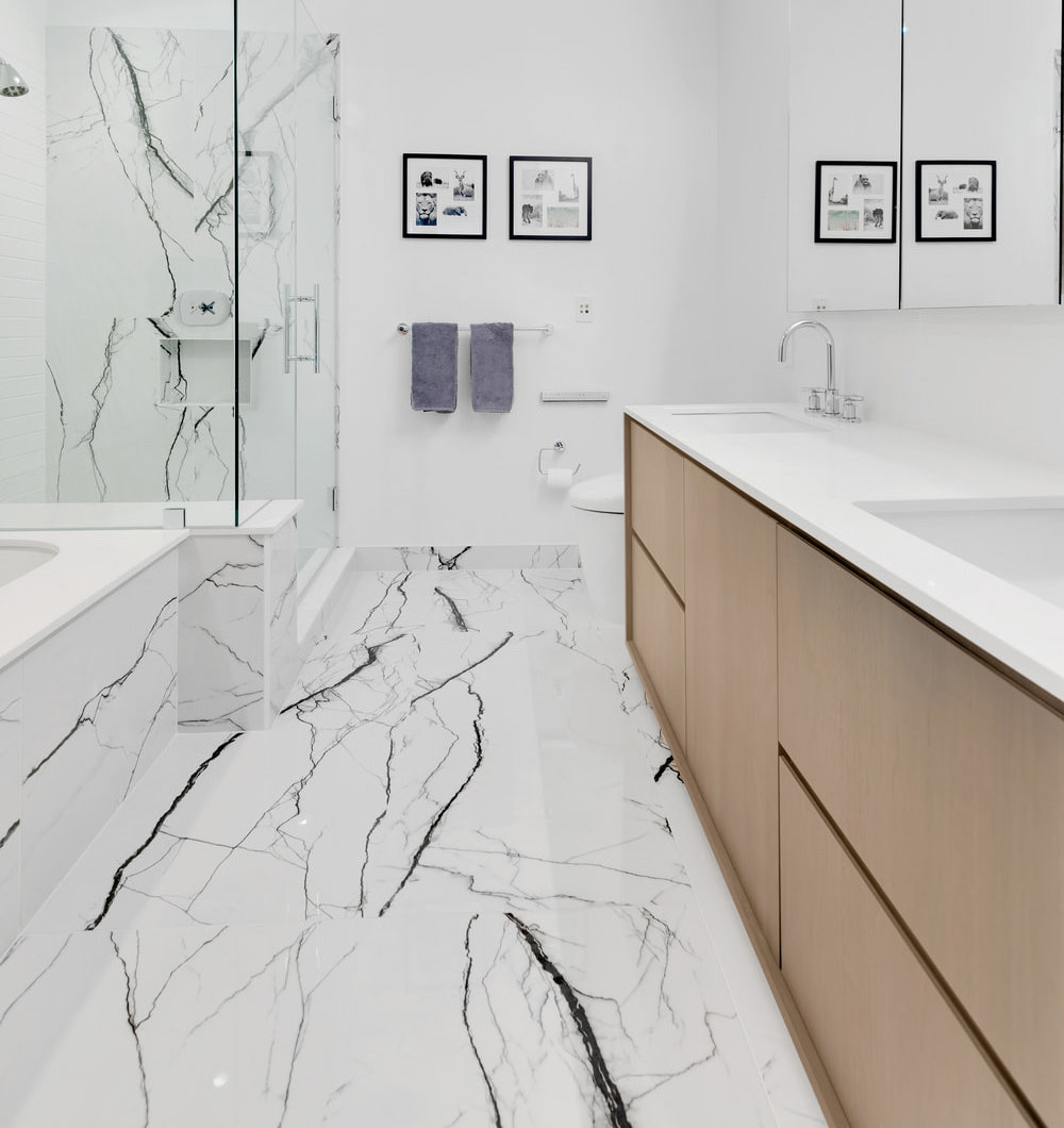 Marble is a popular luxury tile used in the bathroom, providing a soft, pleasant sensation under the feet. It does require upkeep to prevent staining, but dropped items are much less likely to cause any damage in the bathroom. Other common choices for bathroom floor tiles include porcelain, Dekton, or quartzite.