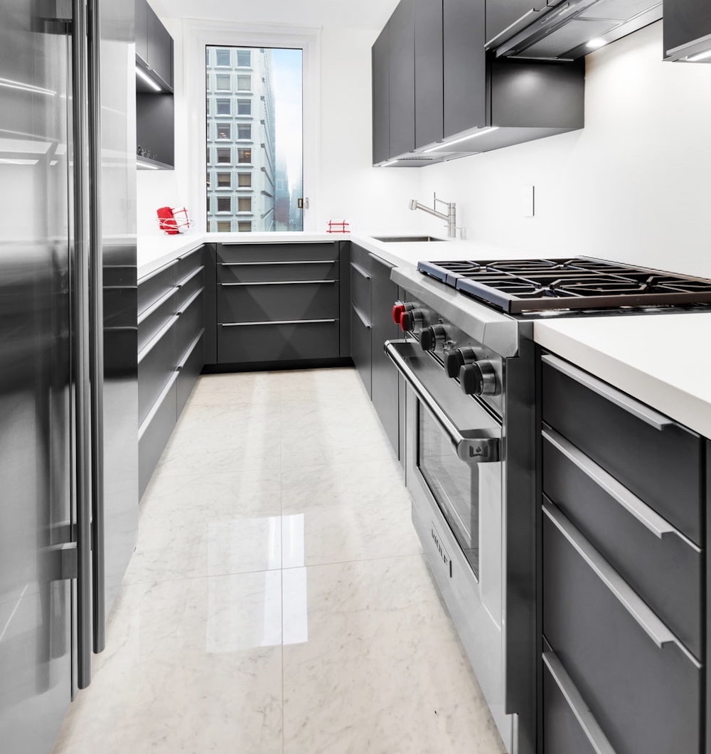 For instance, if you have an open floor plan and want a uniform look across your space, including the kitchen, you need to consider how different flooring materials interact. Wood and tile transitions can be tricky, and the type of wood you choose could affect the cohesion and flow of your space. For instance, consider the flooring in our NYC condo renovation in Carnegie Hill at 8 East 83rd. While the majority of the open floor plan apartment has herringbone wood flooring, determination was made that having herringbone flooring in the kitchen would have been busy on the eye. Instead, we went with straight planks for the kitchen and blended from the living room with a custom wood flooring design.