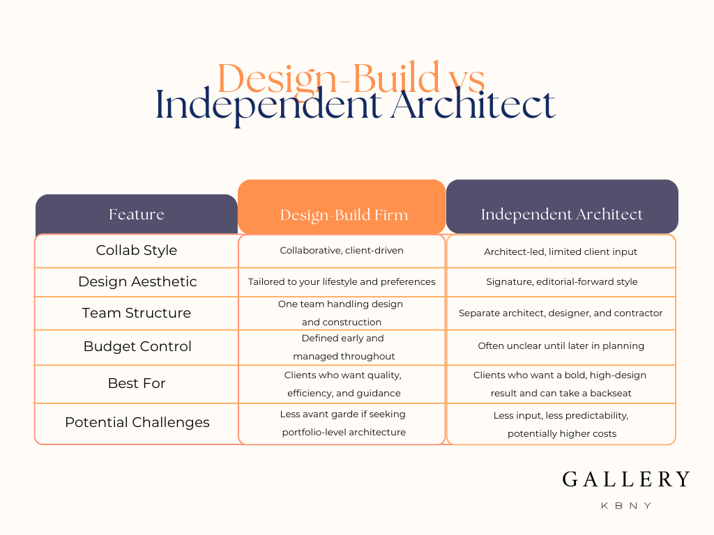 In NYC, that usually comes down to two paths: hiring an independent architect or choosing a design-build firm that integrates architecture, design, and construction under one roof. Each route comes with pros and cons depending on your renovation complexity and intended level of involvement. The breakdown below will help determine which is the better fit: