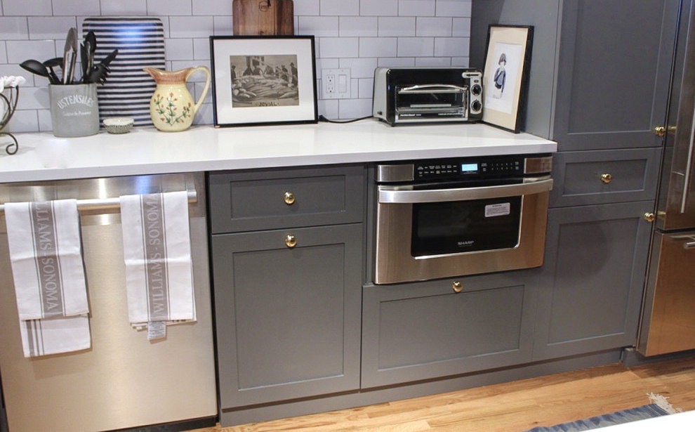 No element, however, better exemplifies the traditional-contemporary blend than this kitchen’s new custom kitchen cabinets. The Shaker-style silhouette is a country kitchen classic, but the dark gray exterior is very modern, and even a little off-beat. Gray is a dependable option for those who want minimalism, or an off-white palette that still feels human and inviting.