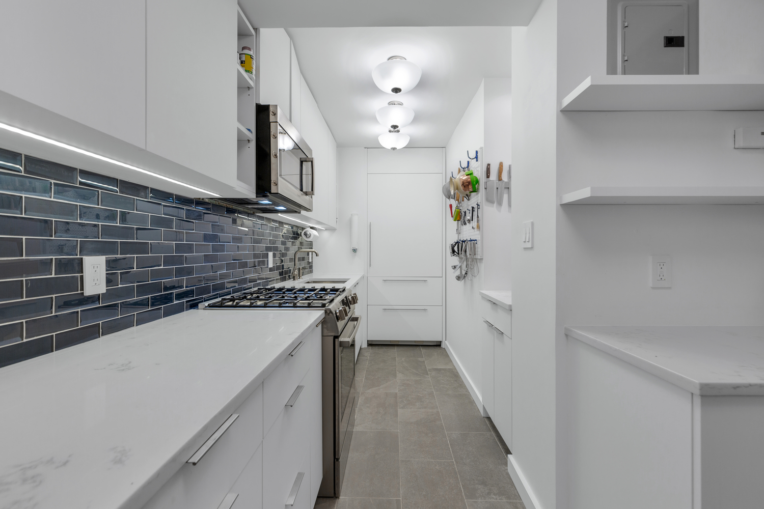 For this co-op renovation in Greenwich Village, the clients wanted a contemporary kitchen design with a striking accent color. To make matters more interesting, the slender galley had no windows or natural light. In the renovated kitchen, white flat panel custom cabinets preserve as much openness as possible, with three-dimensional deep blue subway tile backsplash providing color and contemporary flair. View the full Greenwich Village co-op renovation before and after.