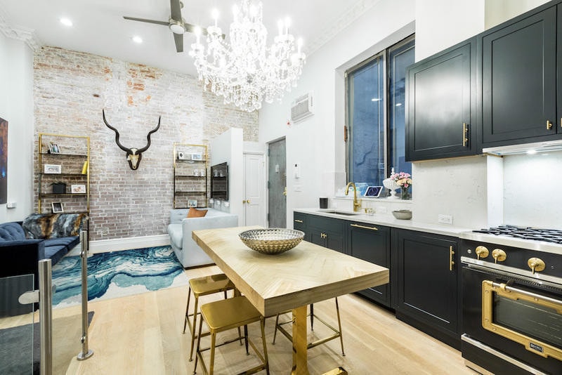 When the owners of this Greenwich Village co-op apartment contacted Gallery, the existing kitchen lacked character, the brick walls were hidden, and the hardwood floors were worn out. During the design meetings our designers discovered that our customer leaned towards the traditional and industrial aesthetic for their NYC apartment renovation. To meet their design goals, we incorporated custom kitchen cabinets in a matte black finish with champagne pull handles and fixtures for a traditional touch, then added contrast and an industrial feel via an exposed brick accent wall with a distressed look. Lastly, we installed new hardwood 5″ select oak floors, renovated the entire bathroom and repainted the entire apartment. View the full Greenwich Village apartment renovation before and after.
