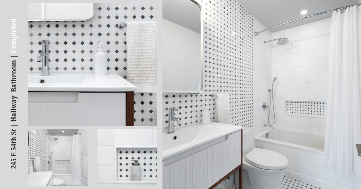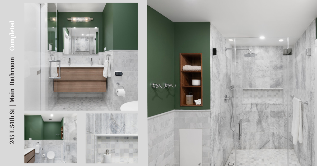 At the time of this Sutton Place co-op renovation, our clients were expecting their first child. Weighing the choice between relocating or renovating their current home in The Brevard—a modern post-war co-op in Midtown East—they decided to stay and transform their existing space. Enter Gallery. Upon consultation, we found their renovation goals focused on modernizing the kitchen, two bathrooms, and choice details throughout the home, including custom millwork around P-TECH units. Our design leaned toward a mid-century modern style, with primary focus on functionality and modernization. A fresh start, from the comfort of home. View renders for both bathrooms from the project above, then see the finished renovations of both rooms below. View the full Sutton Place renovation before and after.