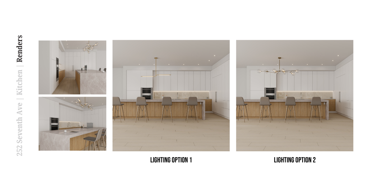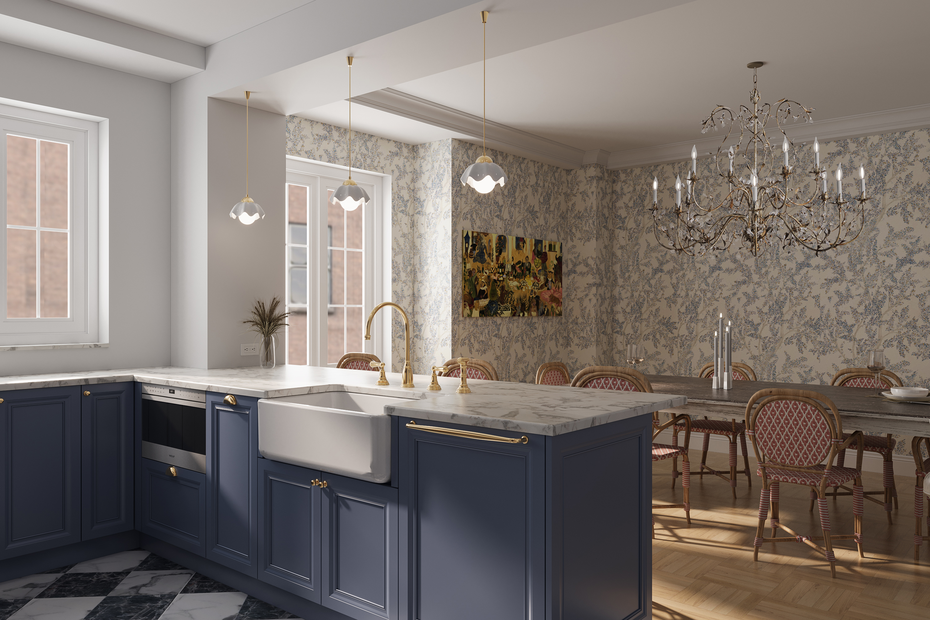 This sizable Manhattan renovation found us overhauling a previously-combined two-unit condo in The Chelsea Mercantile, an iconic 19-story pre-war building in Chelsea. Our clients, a couple with three small children, acquired the enlarged 252 Seventh Avenue residence with an aim to blend modern comfort with the charm of yesteryear. In the renderings above of the kitchen design, we helped the client decide on which statement pendant to choose by offering two different options that showed each option within the final kitchen design. See their final selection via the completed kitchen design, then view the full renovation before and after.