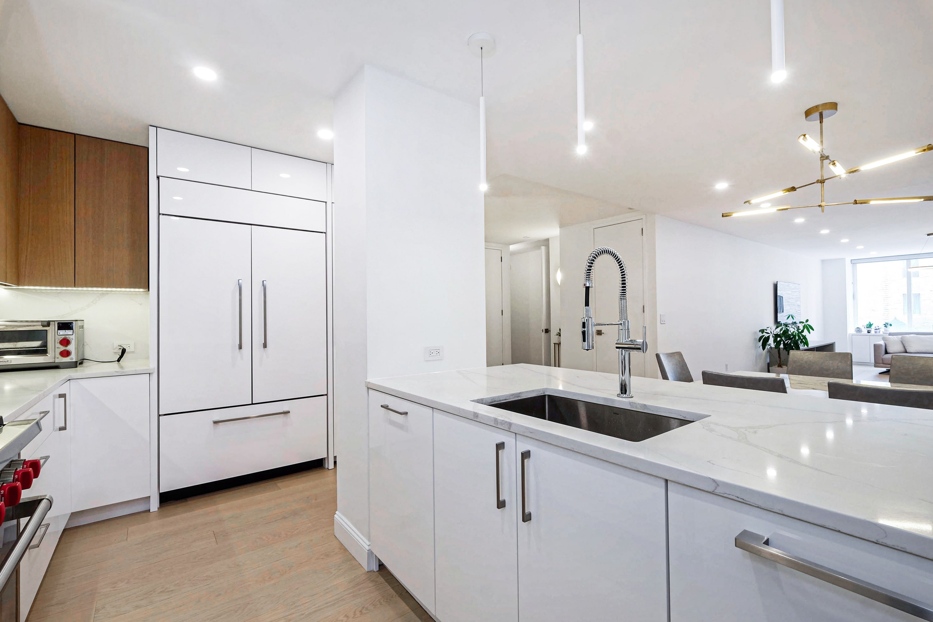 For this apartment renovation in Manhattan, we completely tore down the walls enclosing the small kitchen and created a roomier, more free-flowing space. We then added an island with a waterfall quartz countertop bar to transition from the living area to the kitchen.