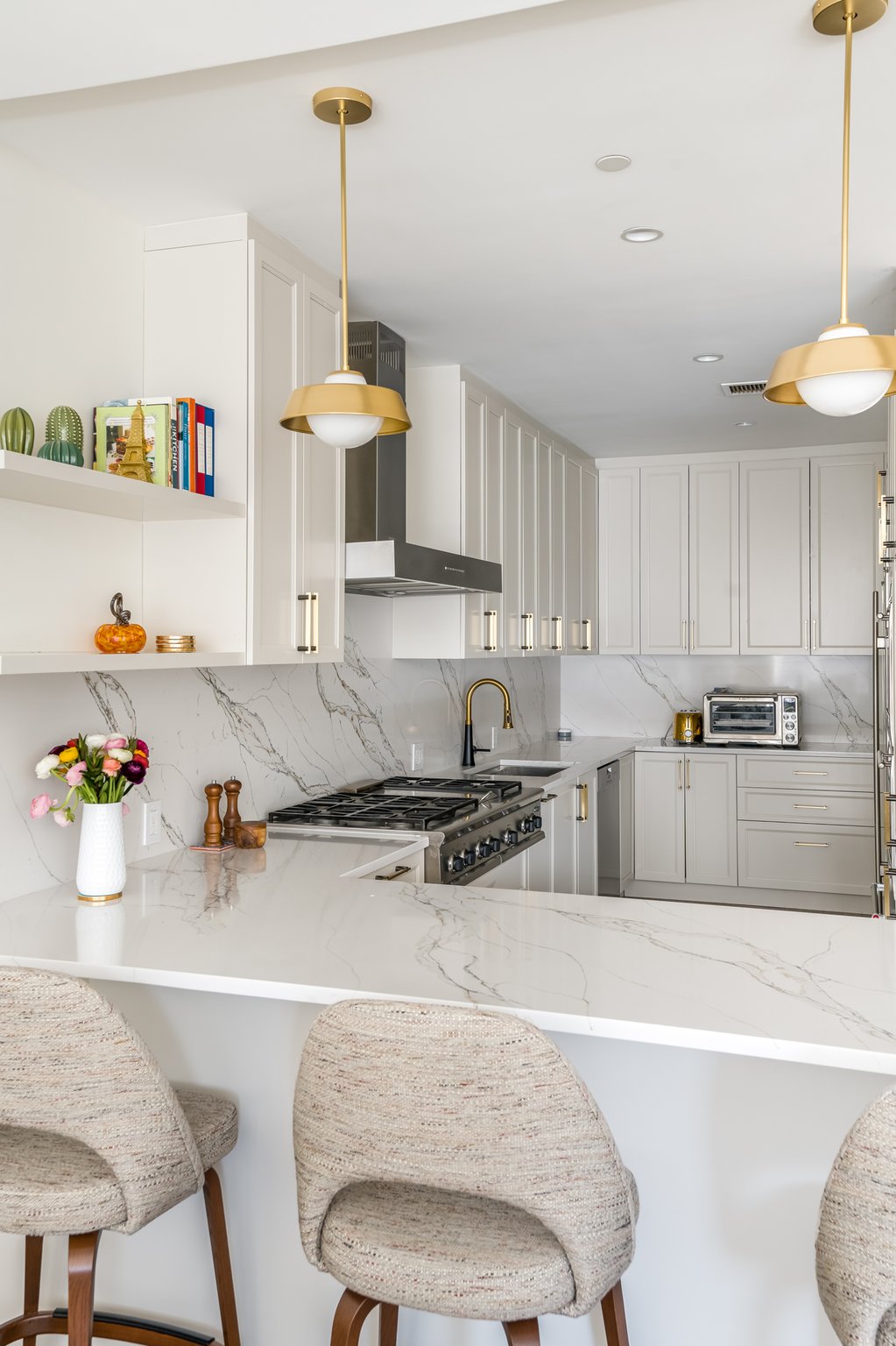 The most modern approach to kitchen layouts is an island and peninsula layouts, which brings both function and flexibility to your kitchen design and home overall. An island works best in kitchens with at least 3 to 4 feet of clearance on all sides, providing enough room for comfortable circulation. One of our favorite island designs comes from our Manhattan condo renovation in The Chelsea Mercantile at 252 Seventh Ave, which features a massive island as the centerpiece to the space, which we built up to three inches to create a thicker appearance for the elegant and calm gray Armani Silver marble countertop. In tighter apartments, a peninsula—attached on one end to a wall or cabinet run, offering similar benefits with a smaller footprint. See an example of a convenient peninsula design in our Sutton Place co-op renovation in The Sovereign at 425 East 58th Street.