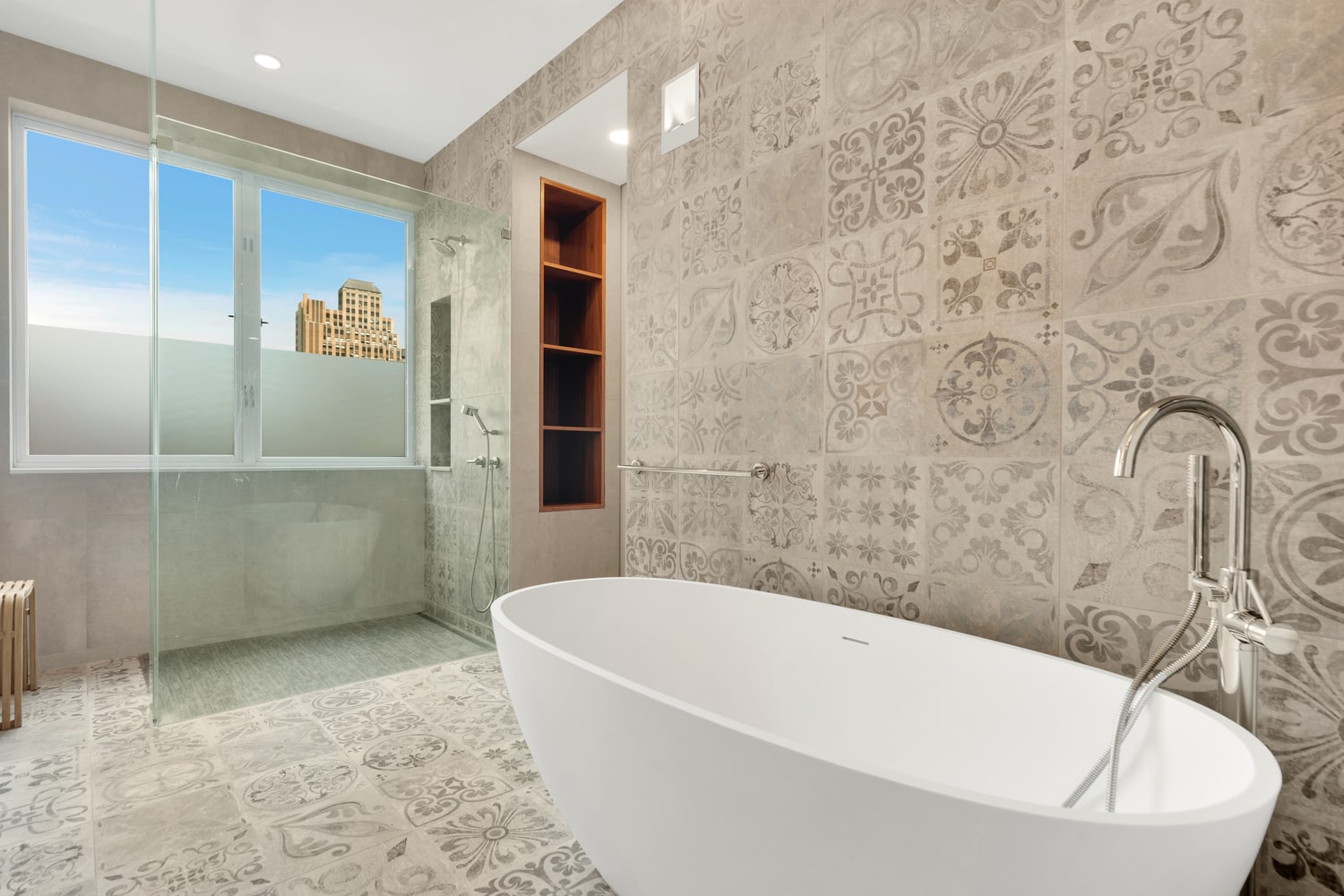 Checkerboard design patterns are not new, but they’re definitely trending up, especially in bathrooms. A black and white checkered floor (like the one we installed in this Tribeca ensuite bathroom) adds a pristine nostalgia that resonates with most aesthetics, making this one of the most popular bathroom interior design trends of 2025.