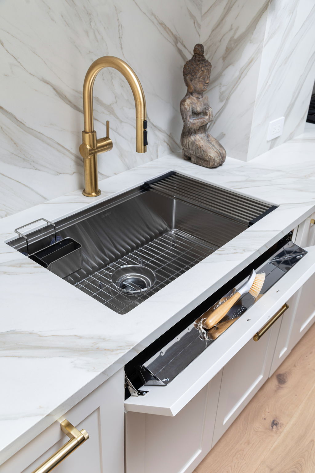 Another highlight from our Chelsea co-op renovation is this custom tip-out tray keeps cleaning essentials discreetly tucked away while remaining instantly accessible. Integrated into the sink cabinet, this sleek storage consideration makes smart use of shallow space often left unused, maintaining a clutter-free countertop and elevating both function and design. Paired with brass hardware and a sleek under-mount sink, the result is an everyday kitchen detail that feels like a must-have in hindsight.