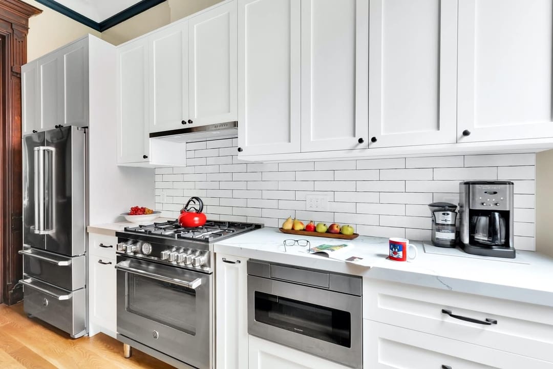 In this stand-out brownstone kitchen renovation, the historic spirit was preserved and highlighted by refinishing the original window moldings and wood casings, as well as renovating and repurposing the brownstone’s original built-in arches, originally used as closets, into a nook with extra storage. View the full renovation via our Before + After portfolio here.