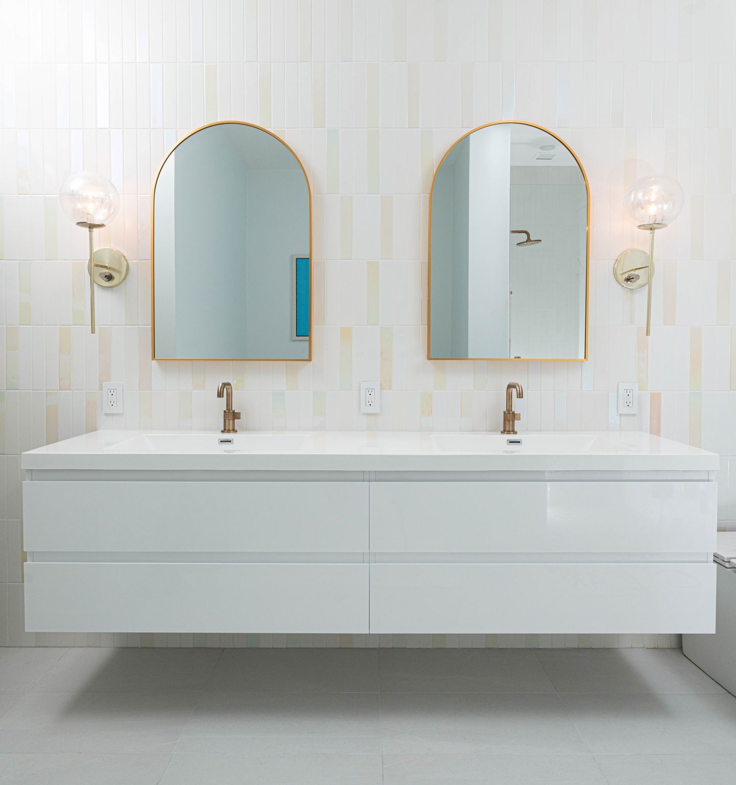 In the kids en suite bath, we leaned into a clean, playful shine with Nemo Glow Snow in a glossy 2 by 10 ceramic. Laid as a smooth field and finished with Vivid White grout, the tile reads bright and timeless at first glance, then comes alive as light shifts across the surface. Glow’s milk finish and subtle holographic character create a soft iridescent rhythm that keeps the space feeling fresh and a little magical without overwhelming the room. The slim, elongated format adds gentle proportion and movement, giving this kids bathroom a crisp backdrop that feels fun now and easy to grow into later. View our full Manhattan condo renovation at The Chelsea Mercantile at 252 Seventh Ave.