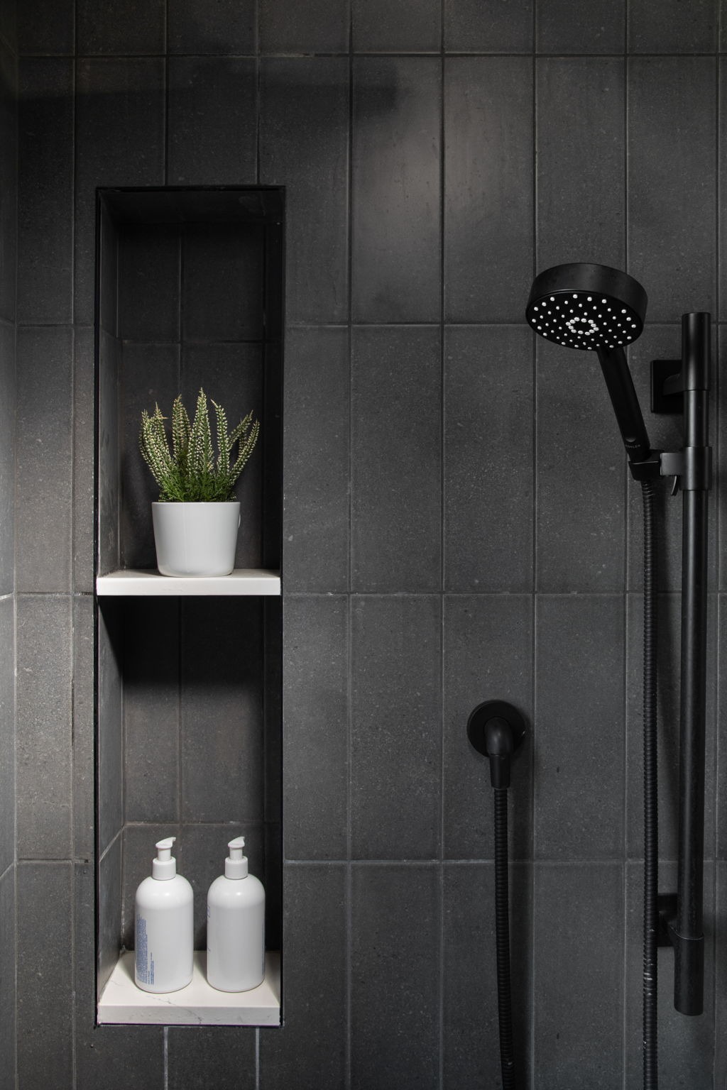 For the shower in our 413 Grand Street renovation, we used Diesel Camp in Rock Gray to create a moody, tailored envelope that feels both modern and quietly tactile. The 4 by 12 matte ceramic tiles are installed in a straight stack, letting the collection’s textile inspired stone texture take center stage without visual clutter. That subtle, fabric-like surface gives the walls depth and softness, while the durable ceramic body handles daily steam and wear with ease. Finished in a French Gray grout, the joints disappear into the field, so the shower reads as one continuous, spa calm backdrop that elevates the niches and black fixtures instead of competing with them. View our full Lower East Side co-op renovation at 413 Grand St.