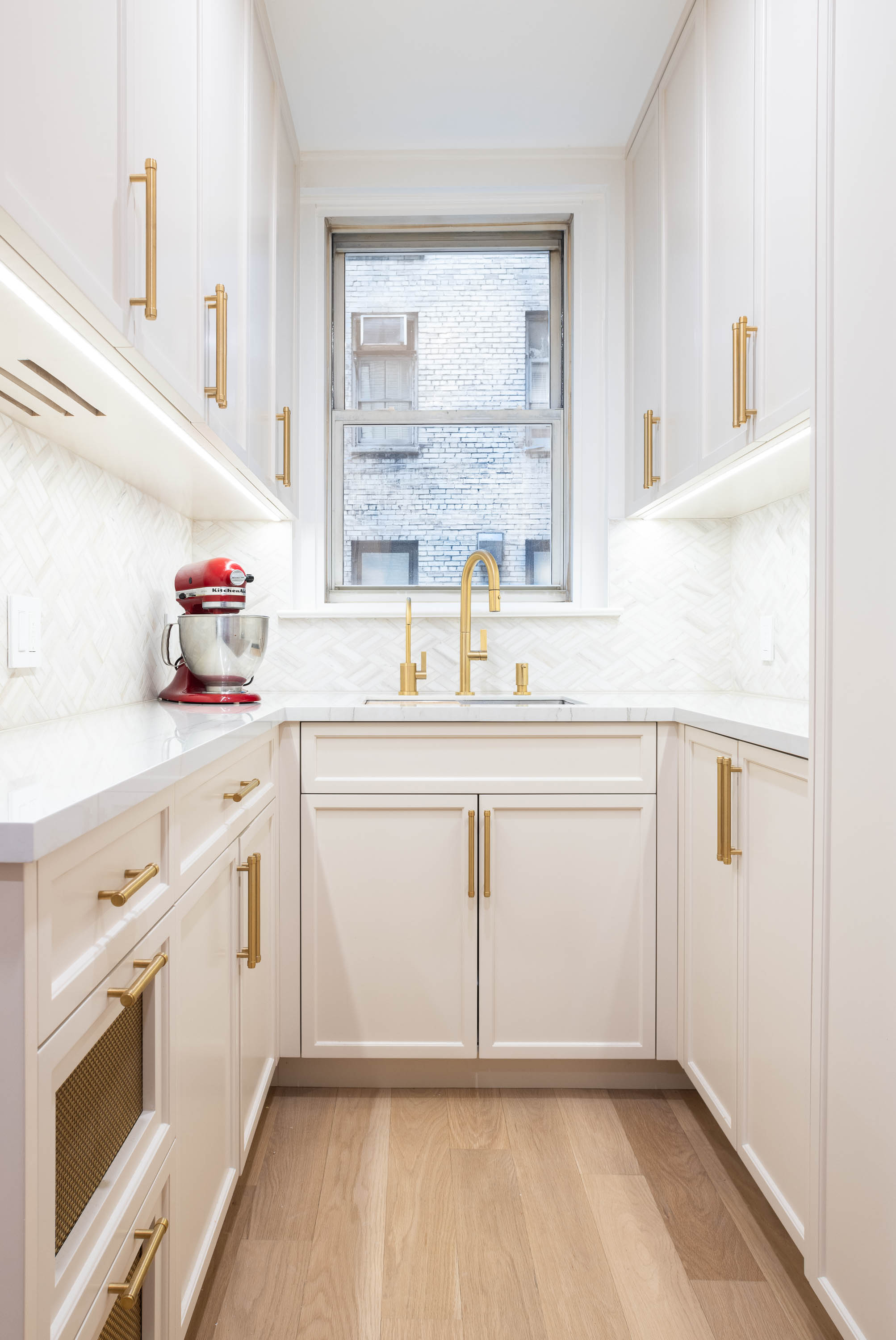 After materials have been sourced, we create life-like digital renderings of the renovated apartment. This includes every aspect of the design, from flooring to fixtures, even showing how renovated rooms will look under different lighting settings. These high-end renderings provide a visual accompaniment to the blueprint that guides construction and helps clients tweak final design decisions like paint color or fixture height. The kitchen render to the right is from our Manhattan condo renovation at The Chelsea Mercantile on 252 Seventh Ave. See the completed kitchen directly below.