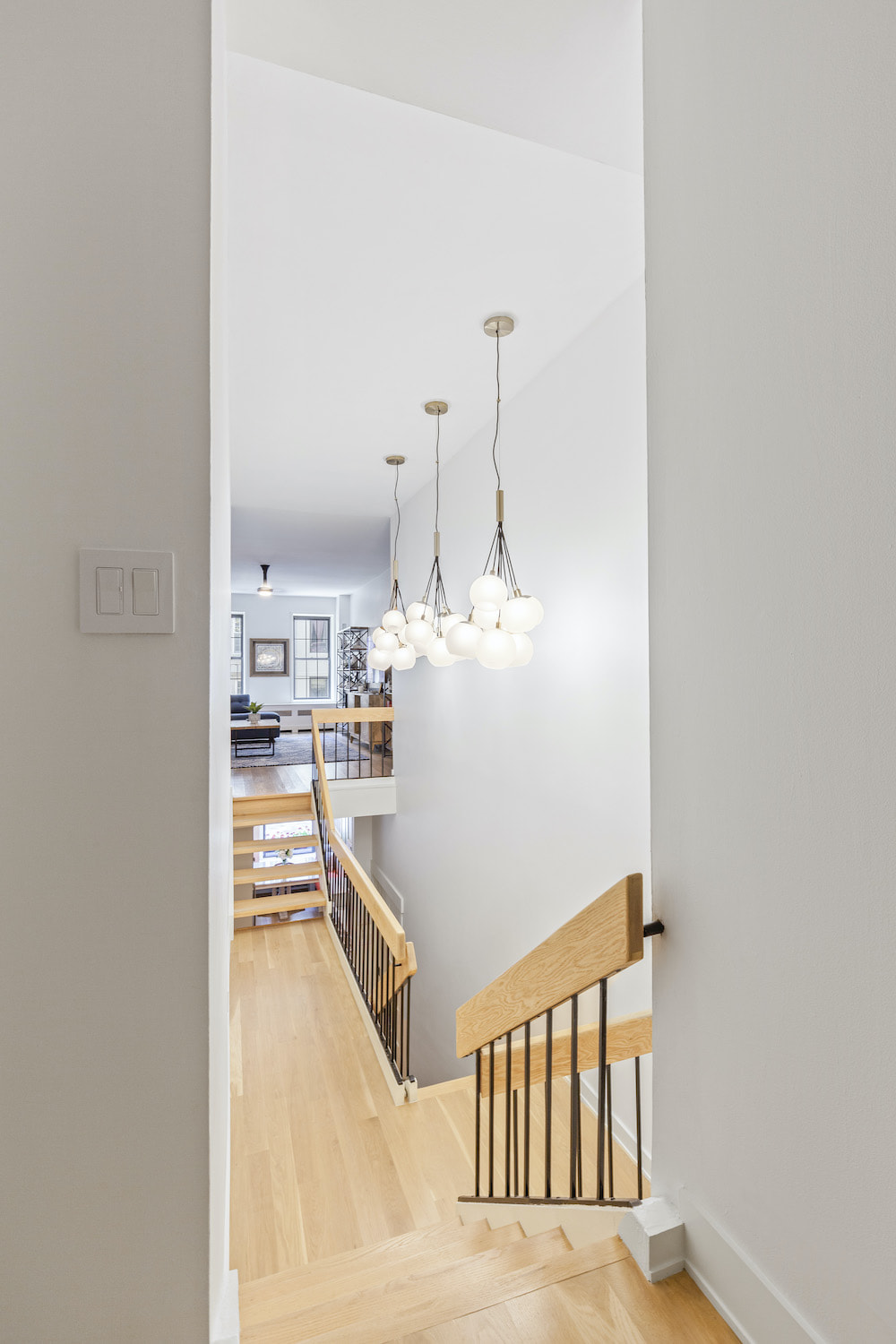 Addressing the challenge of limited natural light often requires creative solutions, such as adding skylights (like you see above the stairwell in our Brownstone gut renovation in Carroll Gardens) or restructuring windows to capture sunlight from multiple angles. Additionally, the strategic placement of reflective surfaces, such as mirrors and glass partitions, can help bounce light around interiors, brightening even the darkest corners.