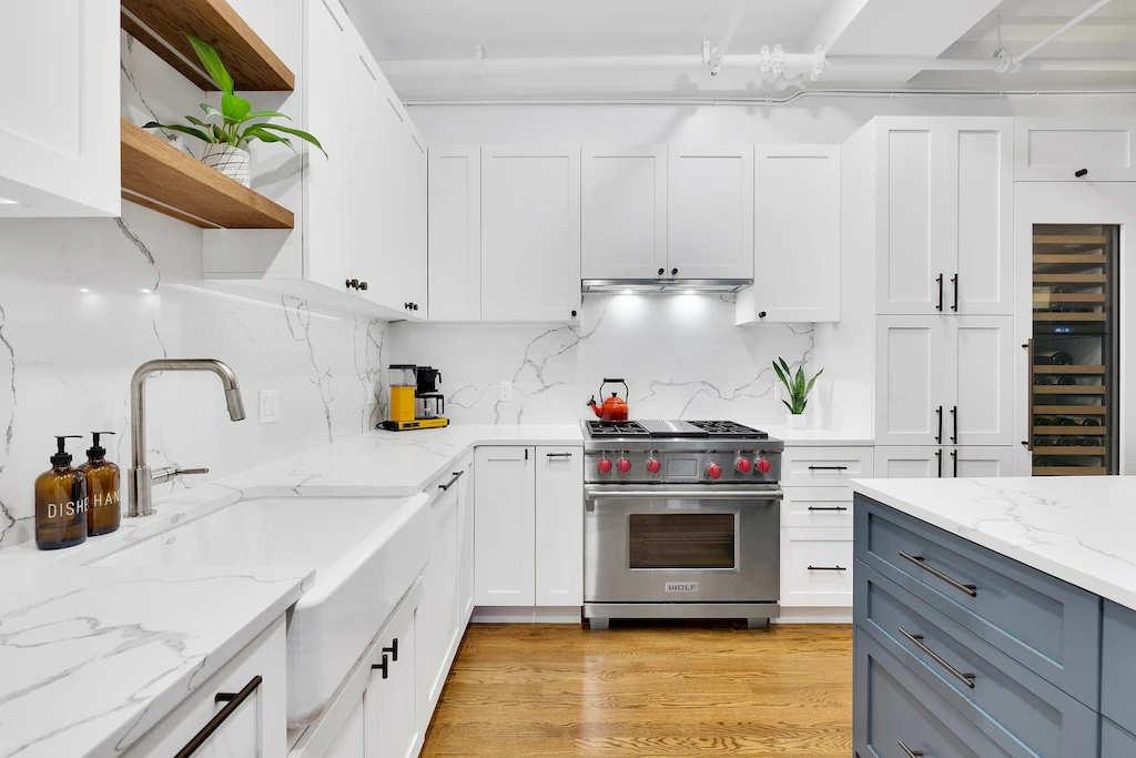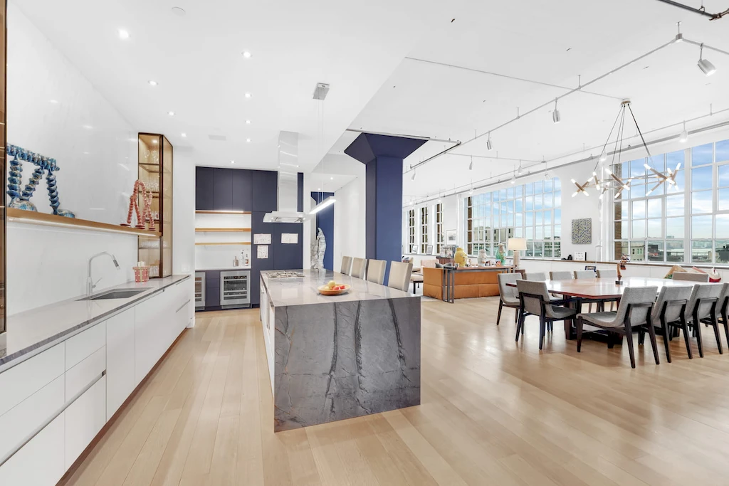 This Tribeca loft renovation required a complete kitchen renovation. Our goal was optimizing space for functional daily use while still offering the ability to entertain friends and family. The luxe kitchen reno included fully custom white shaker cabinets with a contrasting thiol island. White quartz was used for both the countertop and the backsplash, with black knobs and pull handles in a matte finish for contrast. View the full Tribeca kitchen renovation before and after.