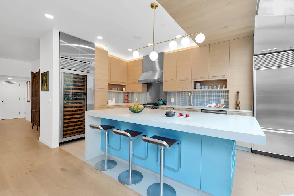 Located in the exclusive Sky Lofts building, this Tribeca loft renovation required us to modernize the centerpiece kitchen. Due to the extravagant nature of the loft (high ceilings, columns, creative and skillful lighting applications, among other factors), Gallery’s expertise in luxury kitchen designs was vital to a successful end result. One such instance was how we managed to get massive slabs of marble for the waterfall countertop into the space without cutting them. Hint: Cranes. Find out more via the full Tribeca loft renovation before and after.