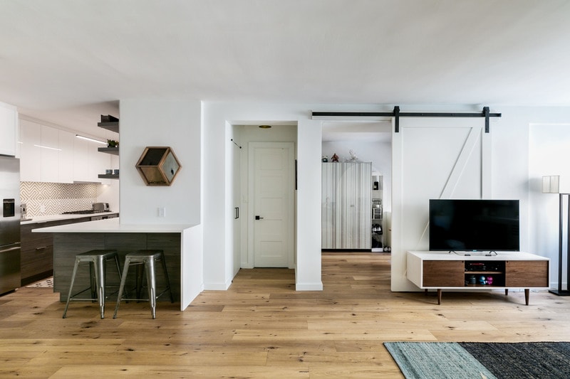This Upper West Side apartment renovation in a Columbus Circle co-op involved the horizontal combination of an existing one bedroom apartment with a newly purchased one bedroom unit next door. As is common with almost any renovation combining two apartments into one, the scope of construction included work being done in both units to ensure a uniform floor and ceiling height and proper integration of the electrical system. The project also included a full kitchen renovation in a mid-century Scandinavian design, plus renovation of a bathroom, new floors and doors, plus paint and general carpentry. View the full Upper West Side apartment combination before and after.