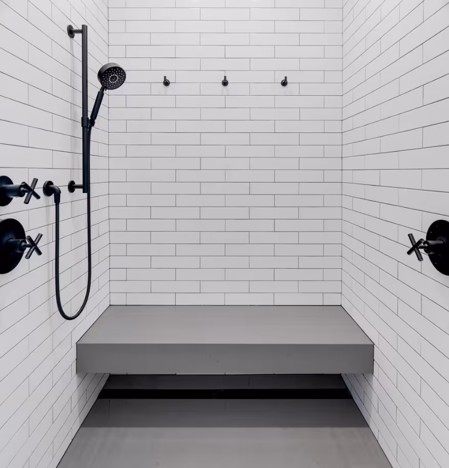 Create a sauna-like atmosphere in your bathroom by adding seating directly in the shower, similar to this stone bench we installed amidst this Tribeca ensuite bath renovation.