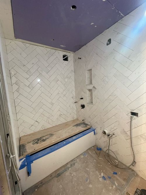 When renovating the bedrooms of 235 Adams, each required a different approach. For the primary bedroom, our client hoped to have more space in the attached ensuite bath. We recommended removing the closet in the adjoined room to provide more square footage, allowing us to reconfigure the space and create a much larger walk-in shower with double glass shower doors. The contemporary but classic space is complemented by basketweave Nemo Ice Grey Honed mesh-mounted mosaic marble floor tiles. We also replaced bulky old radiator covers with much slimmer built-ins that provide less obstruction and easier accessibility.