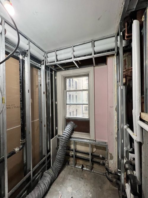 Another significant challenge when renovating this pre-war co-op was creating central air in the space without having to drop ceilings that would impact the period aesthetics, or more importantly block any of the Central Park views. Our solution was a true split HVAC called a VRV system, which we placed in the back laundry room. This required us to turn the space into a formal indoor/outdoor room that allowed the condenser to have circulation of fresh air from outside while still being well-insulated by residing inside. To do this, we removed a window and created an automatic louver that opens and closes accordingly as the VRV system cycles on and off. The room is also equipped with a drainage system so any water managing to trickle inside immediately gets drained. Finally, we ran heat trace lines on all the plumbing pipes so they’ll never freeze, as a secondary measure beyond insulation.